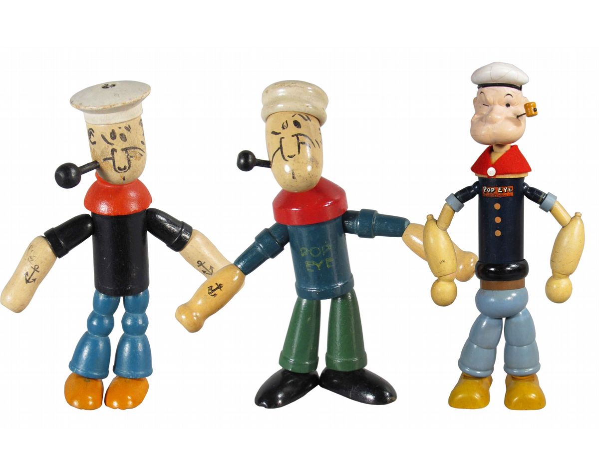 Three Popeye Wood Jointed Dolls. Normal crazing otherwise overall good condition. 14 to 5 inches tall.