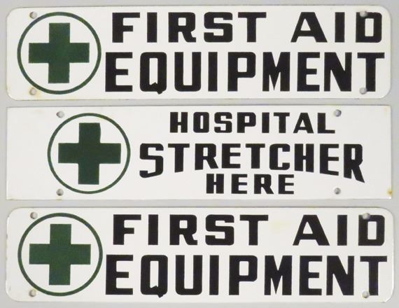 Three Porcelain Green Cross Hospital Signs. First Aid Equiptment and Hospital Stretcher Here. Near mint condition. 14 X 3 1/2 inches.