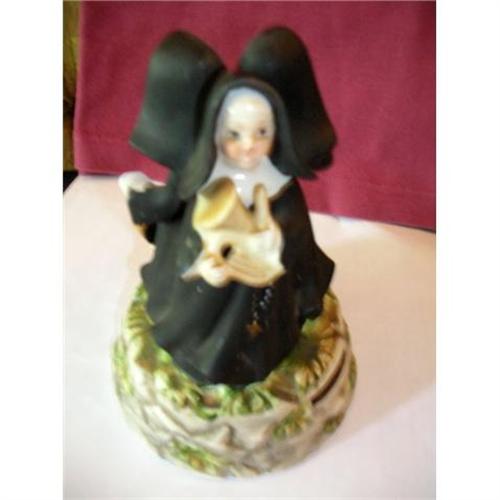 This rare figurine of three co-joined singing nuns, each with a different instrument is marked "Japan" on the base. There is a chip on the biggest instrument as in photo - right next to the left hand holding it but is otherwise authentically old and in good condition. The three photos depict a different nun face each with a different instrument.