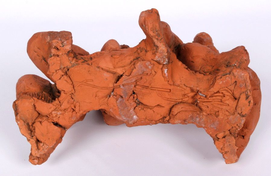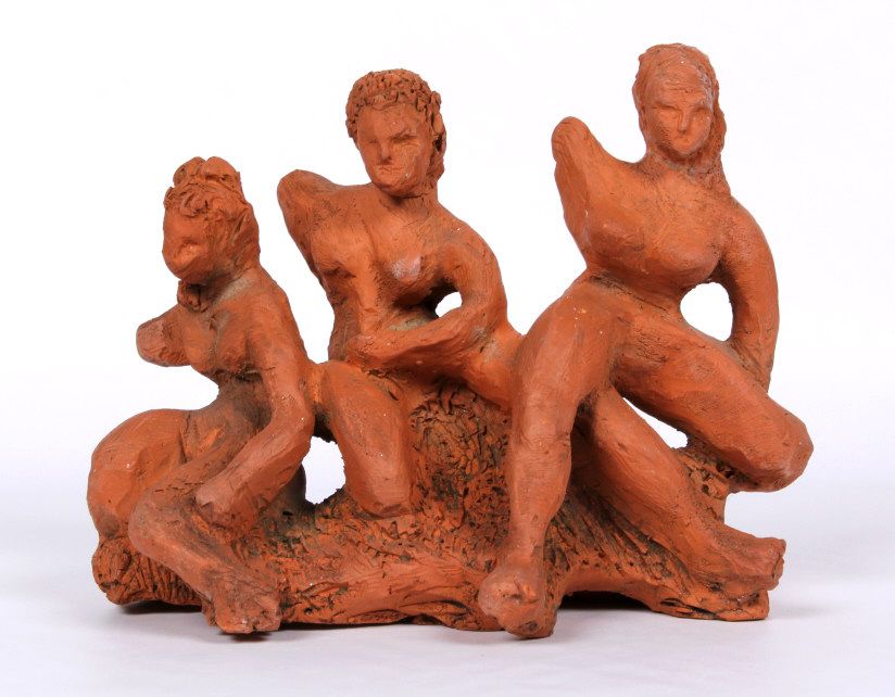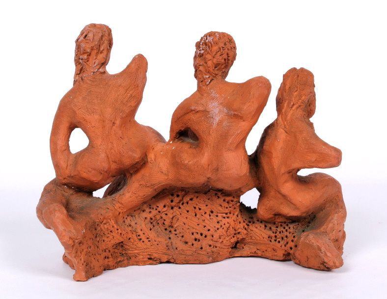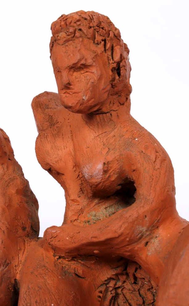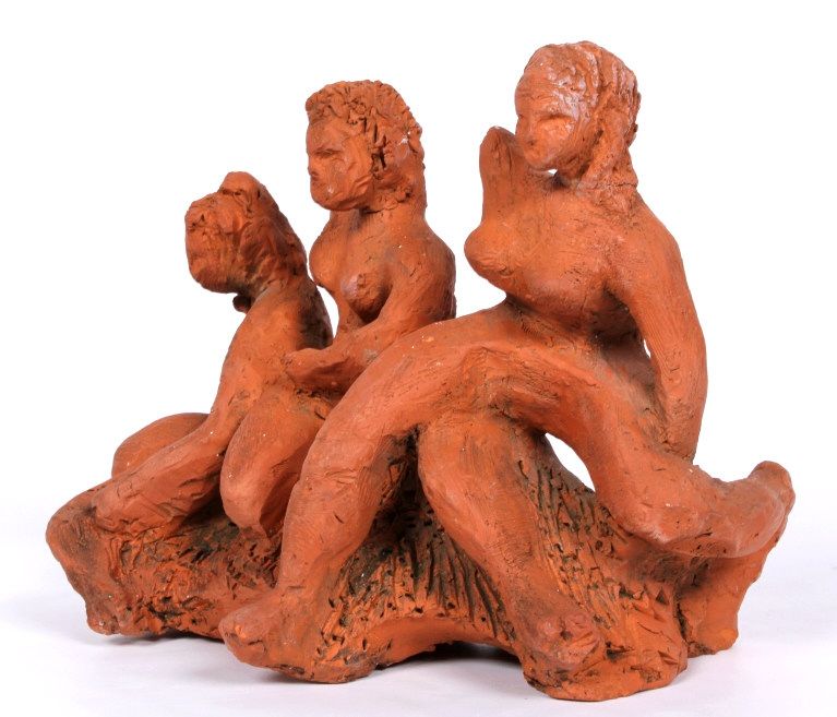The piece features impressionistic red clay sculpture of 3 woman without the right arms. This is all hand made and sculpted the age and origin is unknown. Measures 7.25" tall and 9.5"x6.625"