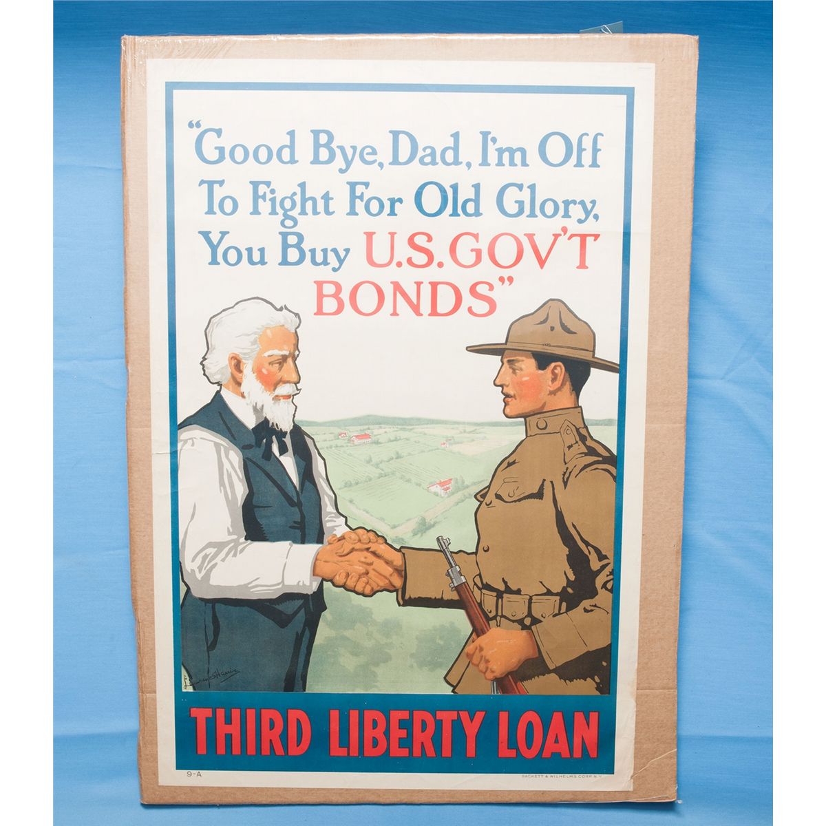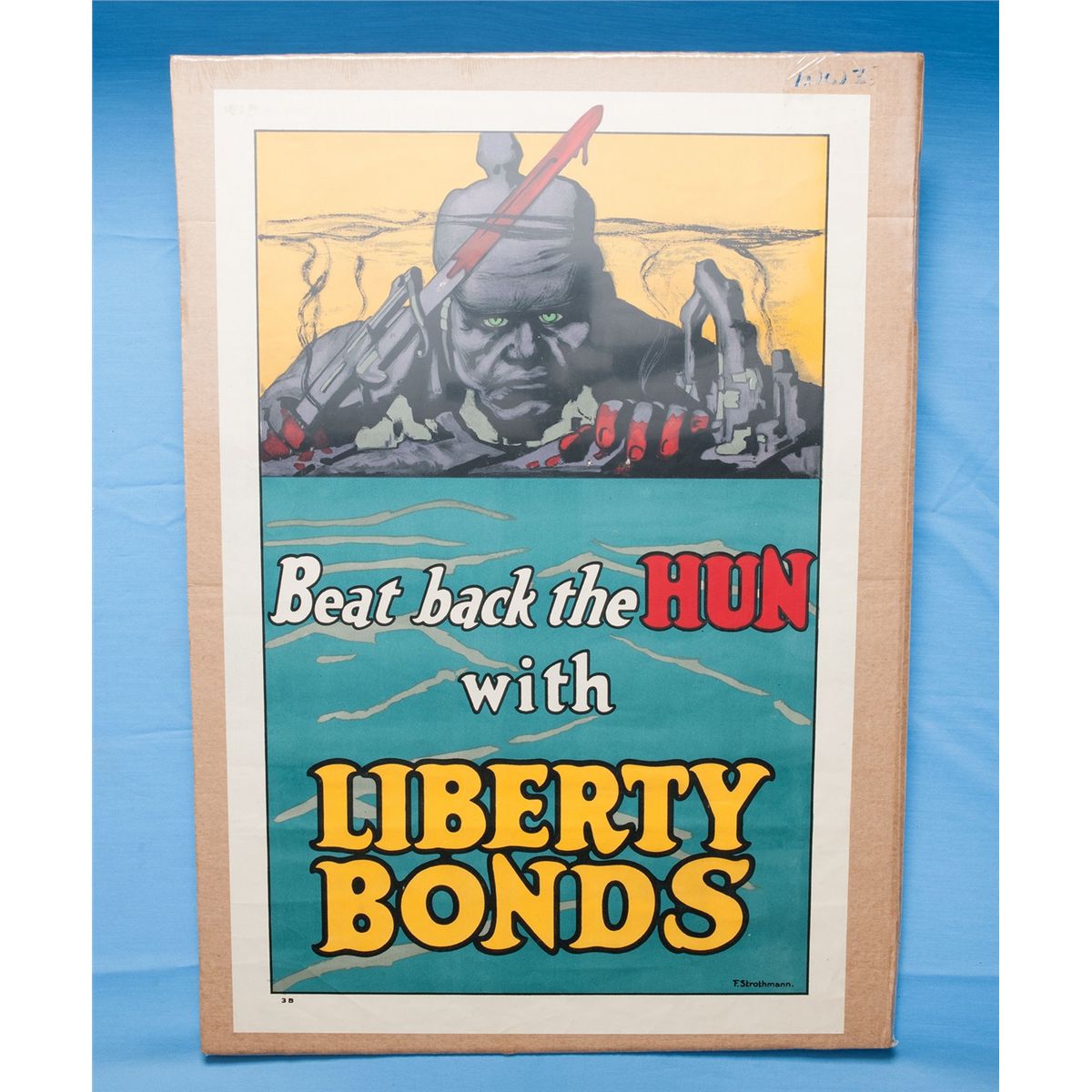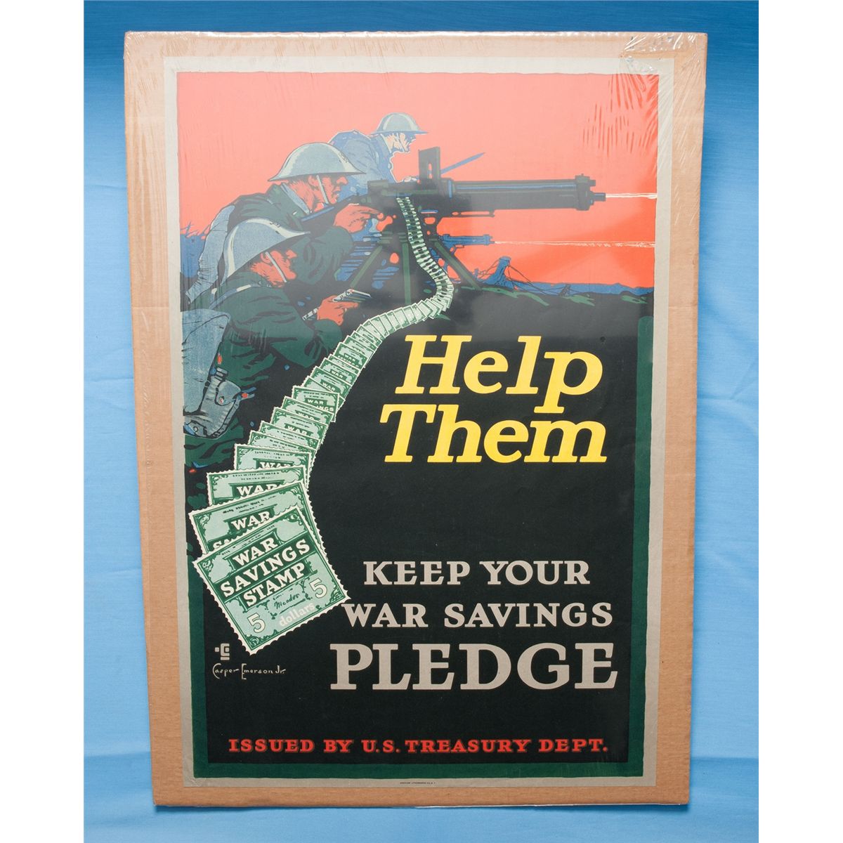 1) "Beat back the Hun with Liberty Bonds" designed by Frederick Strothmann. Measures 20x30 2) "Good Bye, Dad, I'm Off to Fight for Old Glory, You Buy U.S. Gov't Bonds," "Third Liberty Loan" designed by Lawrence Harris. Measures 20x30. 3) "Help Them," "Keep Your War Savings Pledge" designed by Casper Emerson. Measures 20x30. CONDITION: Lot is good to very good overall.