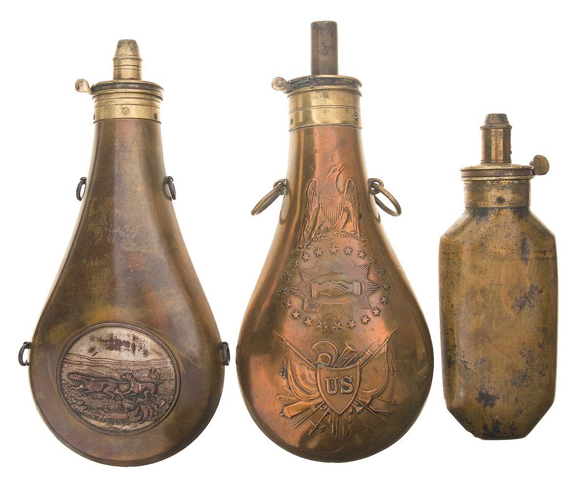 Three powder flasks with the following features: 1) CW Batty marked Clasped Hands Peace Flask, 9 inches long, the spout is marked "1851" 2) James Dixon & Sons marked Sheffield English Powder Flask, measures 6 3/4 inches long, "IMPROVED / PATENT" and "JAMES DIXON / & SONS / SHEFFIELD" marked on the spout, flask faces are unmarked, 3) Sykes Patent English Powder Flask, 8 3/4 inches long, single face affixed with silver hunting dogs scene plate. All three flasks are original and in very fine condition.