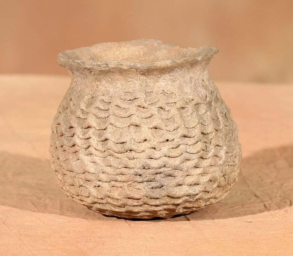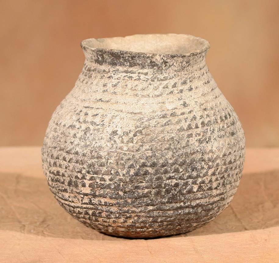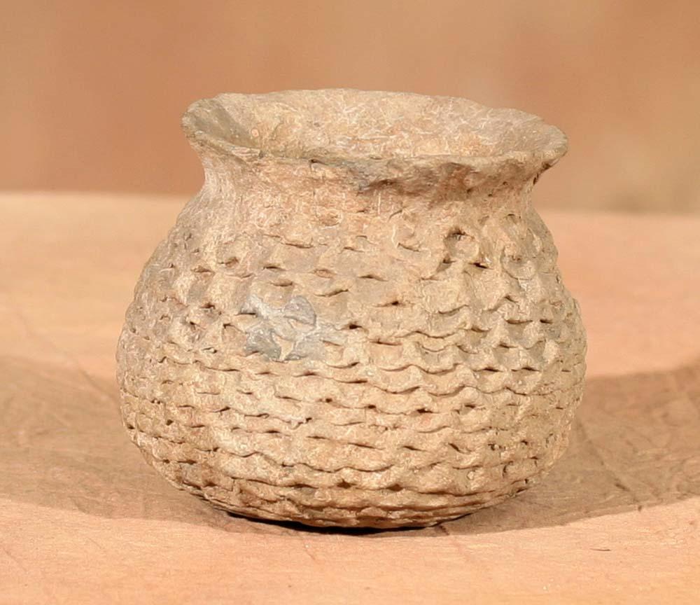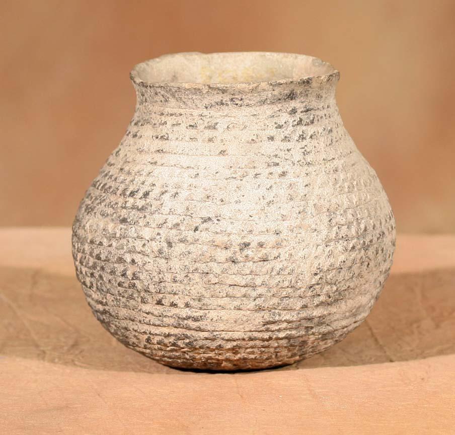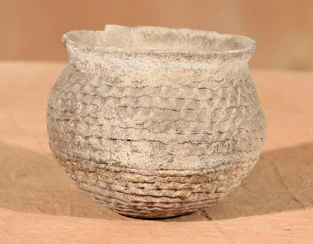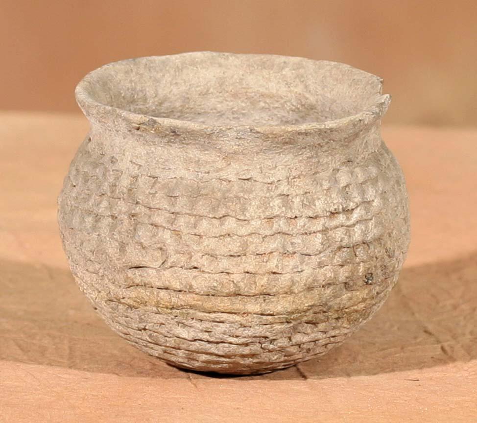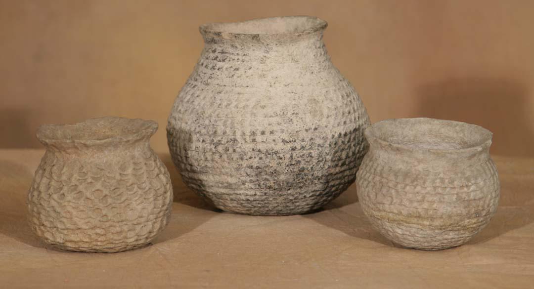 Three Prehistoric Jars. 1) Corrugated Jar. 3 ½" x 3 ½". 2) Corrugated Jar. 6" x 5 ½". 3) Corrugated Jar. 3 ¼" x 3 ¾". Classic fingernail imprinting. (est $400-900). Provenance: Bethany College, Lindsborg, KS. . For condition reports please visit: www.auctioninsantafe.com/cr2011.pdf