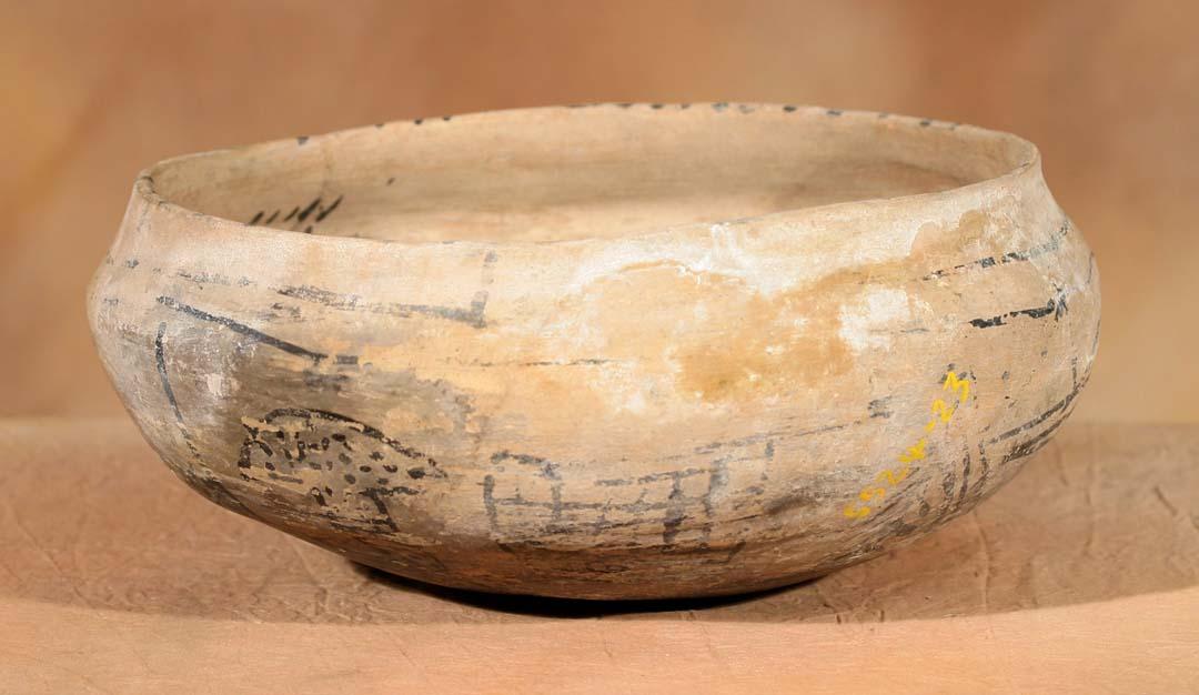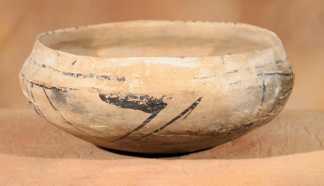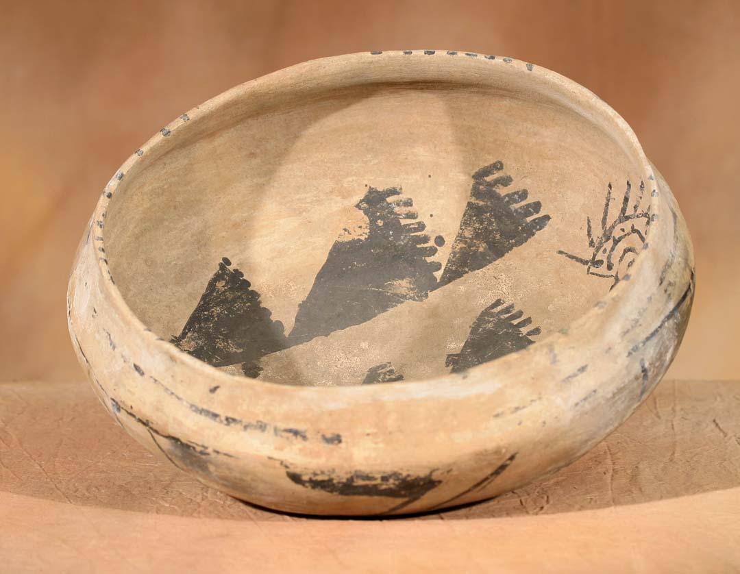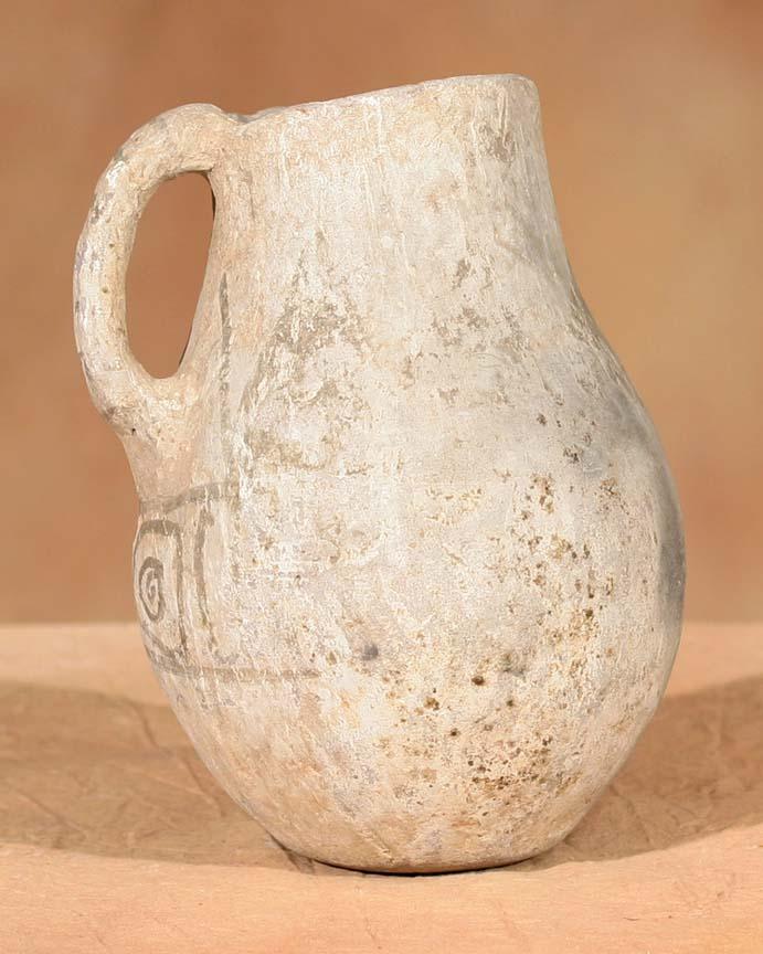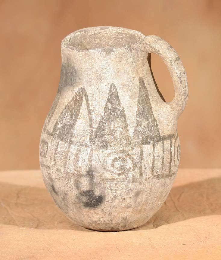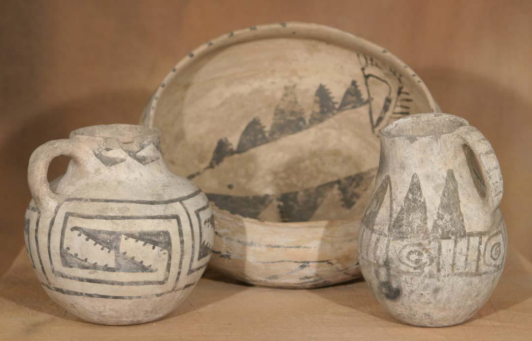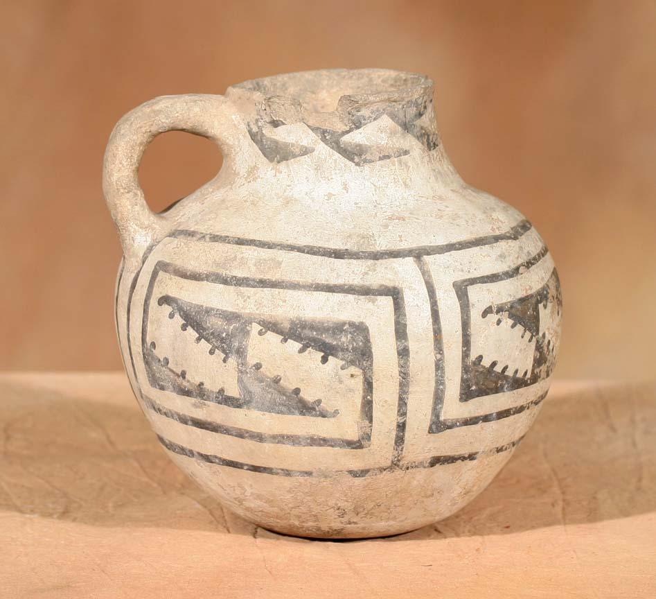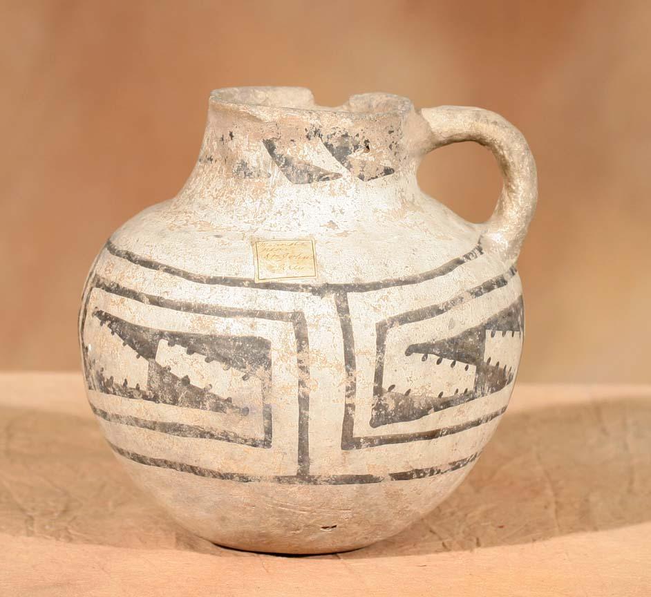 Three Prehistoric Pottery Pieces. 1) Handled Mug. 7 ¾" x 6 ½". Black on white mug with teethed fret designs. 2) Bowl. 6" x 12 ½". Black triangular designs and design on exterior rim. 3) Handled Mug. 7 ¾" x 5". Black on white with abstract designs. (est $1,000-2,000). . Provenance: Bethany College, Lindsborg, KS. . For condition reports please visit: www.auctioninsantafe.com/cr2011.pdf