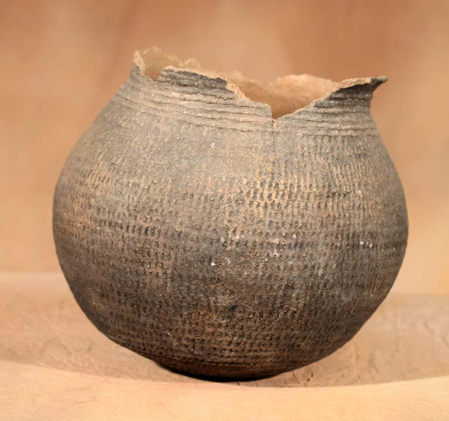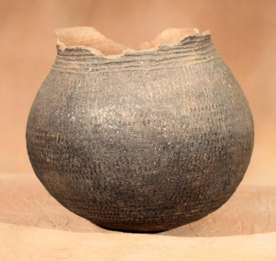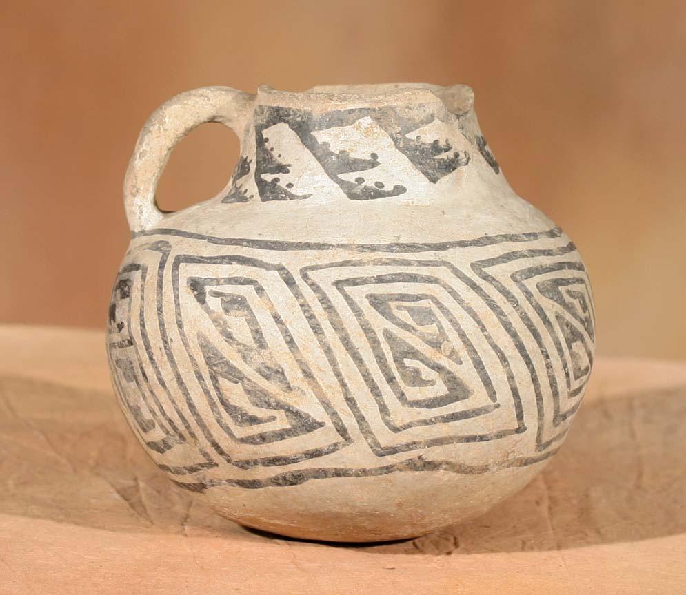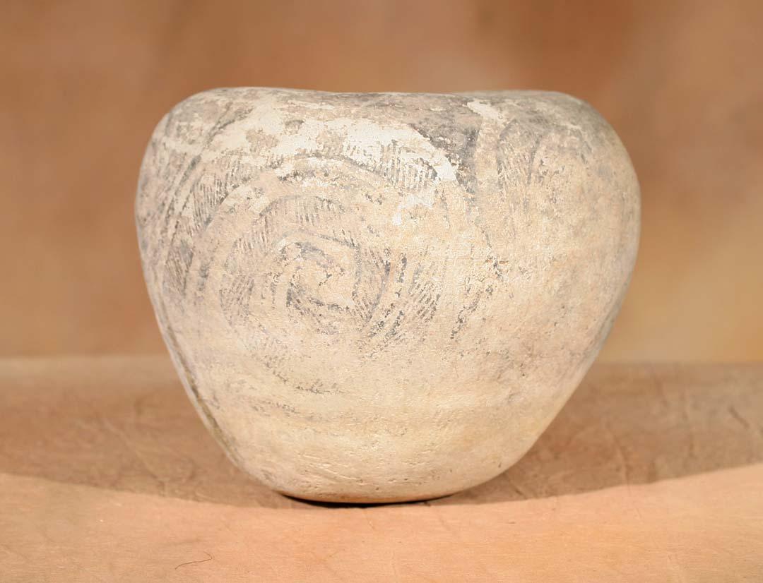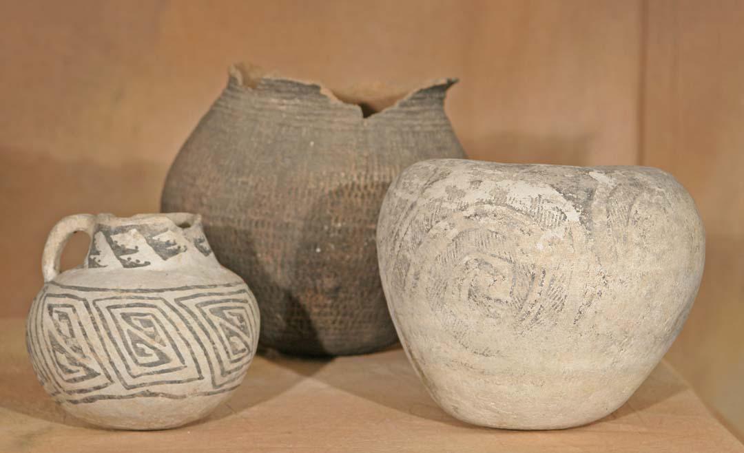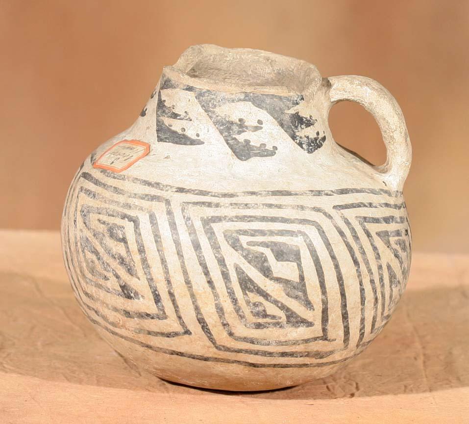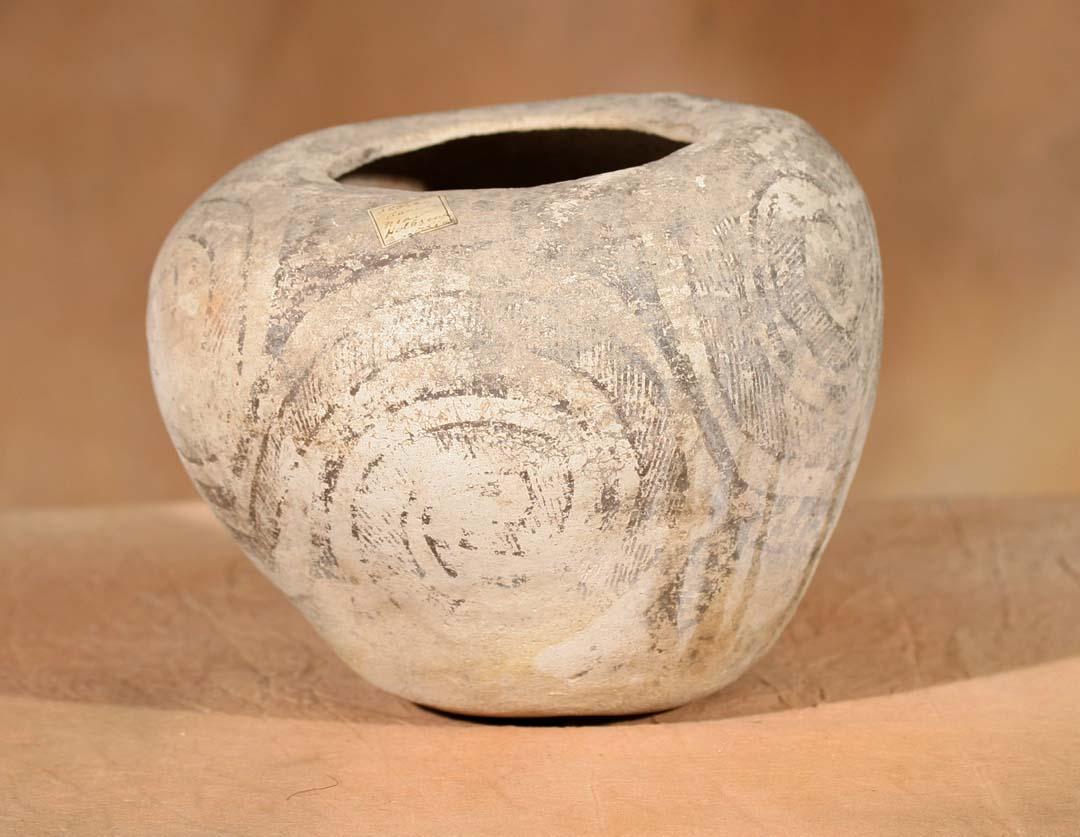 Three Prehistoric Pottery Pieces. 1) Handled Mug. 6 ½" x 6". Black on white with abstract concentric fretting. Bears old label. 2) Corrugated Jar. 9" x 9". 3) Jar. 8" x 8 ½". Black on white featuring spiral design. Bears old label. (est $800-1,500). Provenance: Bethany College, Lindsborg, KS. . For condition reports please visit: www.auctioninsantafe.com/cr2011.pdf