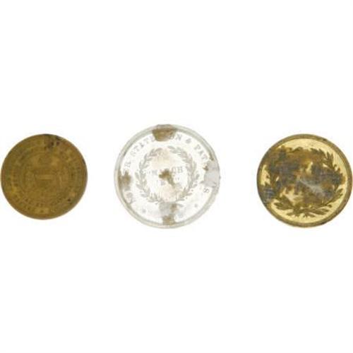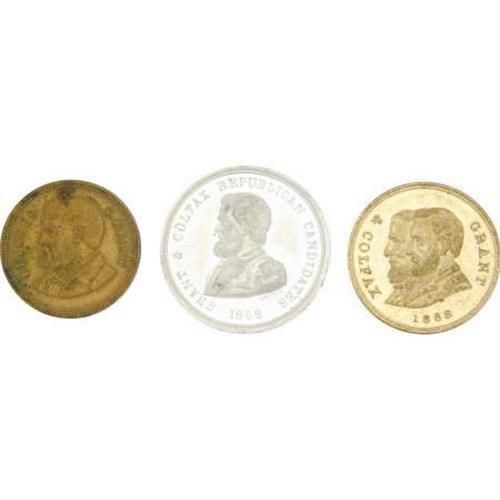 <B>Three President Grant Tokens,</B></I> including a Grant and Colfax, 1868, 31mm, slivered, Soldier Statesman & Patriot Match 'Em reverse; a Grant and Colfax jugate token, 27mm, gilt; and, a Grant token, 25mm, brass, Struck and Distributed in the Municipal Parade By the Employees of the U.S. Mint, Phila, Dec. 16, 1879 reverse. The first two very fine with original finish and luster. The third near very fine. <B></B></I><BR><BR><b>Shipping:</b> Flat Material, Small (<a target="_blank" href="http://www.heritageauctions.com/common/shipping.php">view shipping information</a>)
