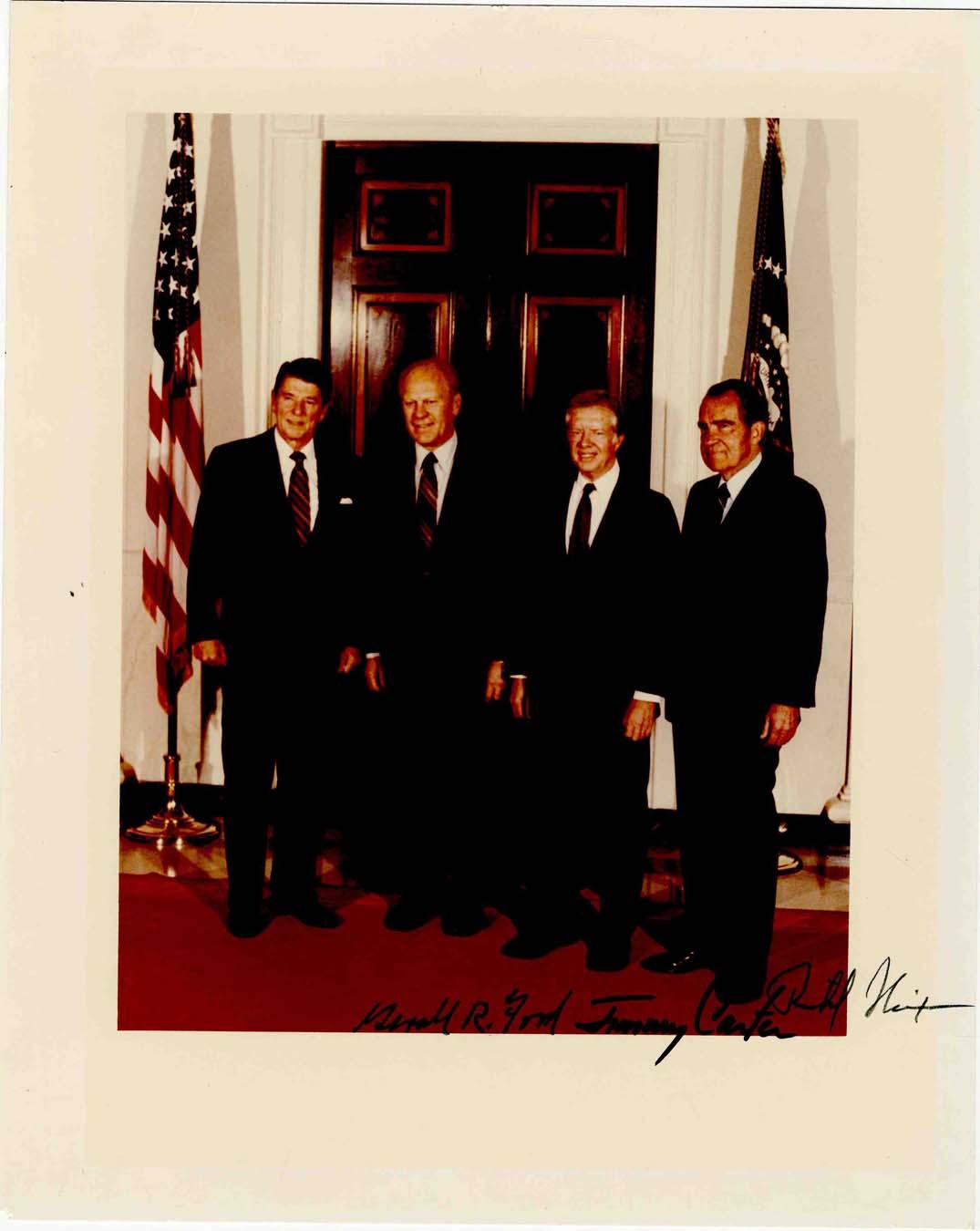 Signed 8'' x 10'' color photo of four Presidents standing tall, from left to right: Ronald Reagan, Gerald Ford, Jimmy Carter and Richard Nixon. Nice, bold signatures by all men except Reagan. Near fine condition.
