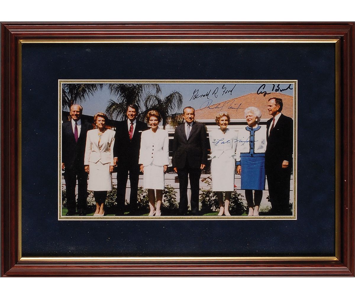 Color satin-finish 11 x 7 full-length photo of the Fords, Reagans, Nixons, and Bushes posing together outdoors, signed in blue or black felt tip by George Bush, Gerald R. Ford, Richard Nixon and Pat Nixon. Double suede matted and framed to an overall size of 17 x 12.25. In fine condition, with image slightly grainy.