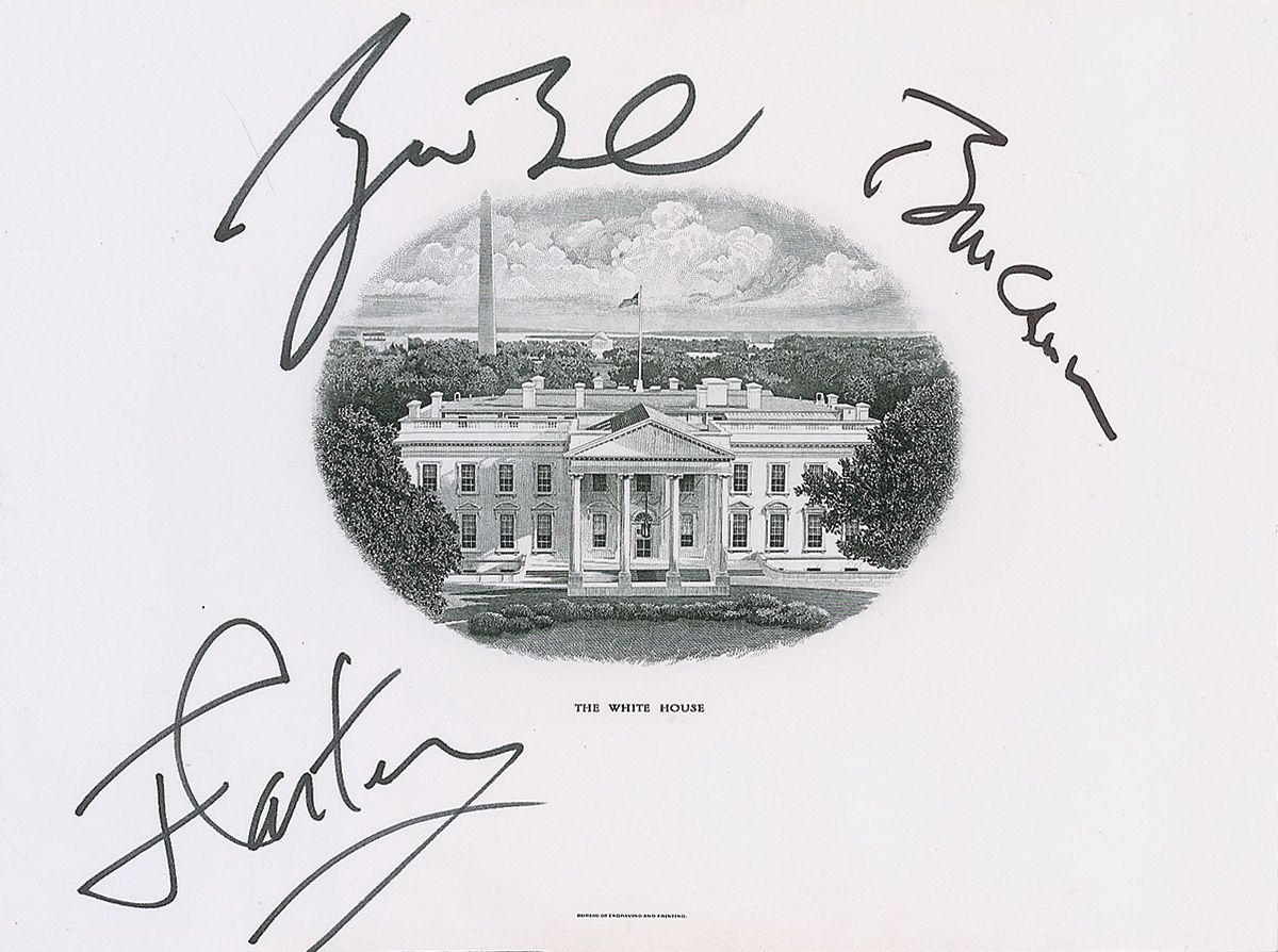 Engraved portrait of the White House, 8 x 6, by the Bureau of Engraving and Printing, signed in black felt tip, “George Bush,” “Bill Clinton,” and “J. Carter.” In fine condition.