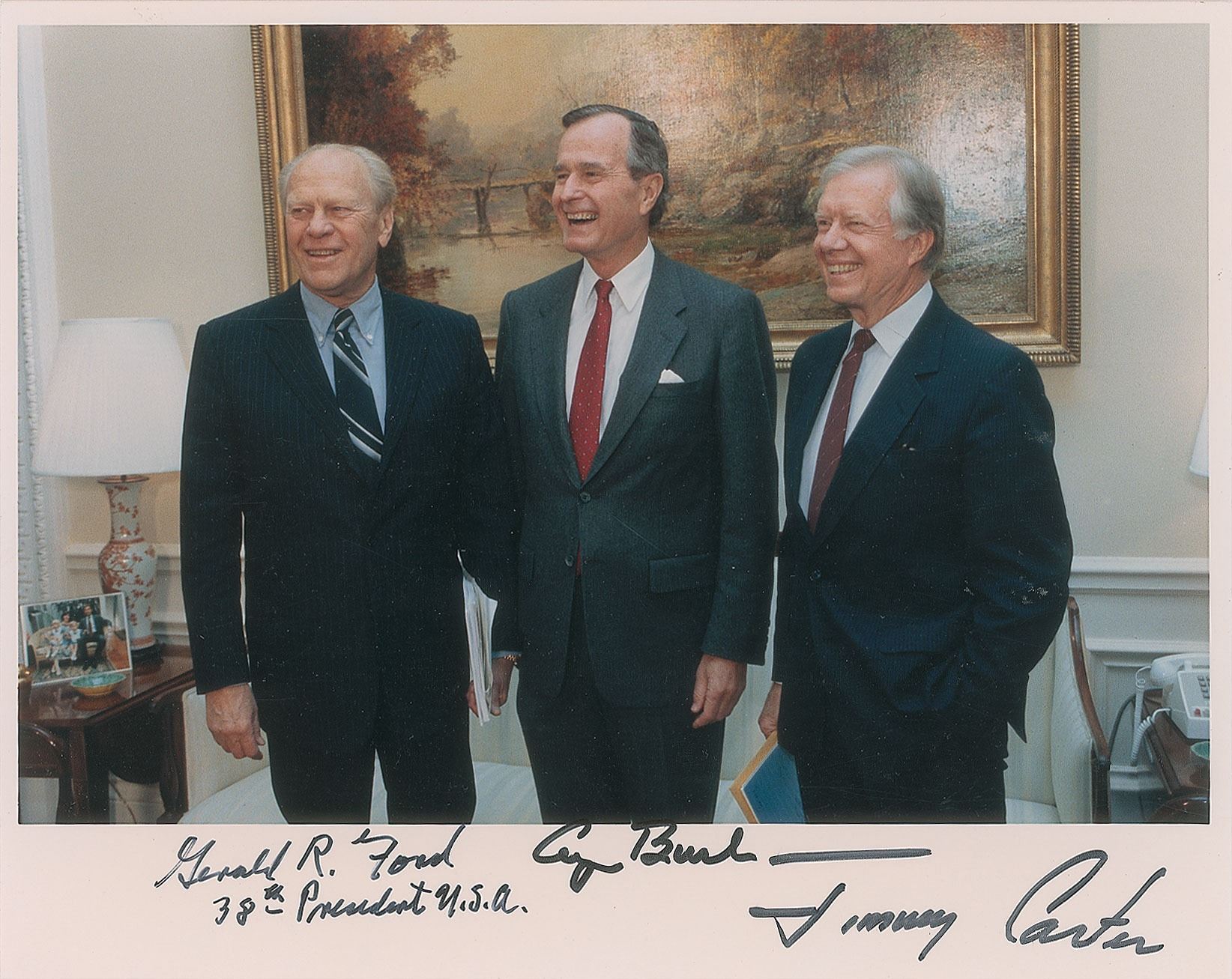 Color satin-finish 10 x 8 photo of the three presidents together, signed in the lower border in black felt tip, "Gerald R. Ford, 38th President U.S.A.," "George Bush," and "Jimmy Carter." Reverse bears a David Valdez/White House credit stamp. In fine condition, with scattered light surface creases.