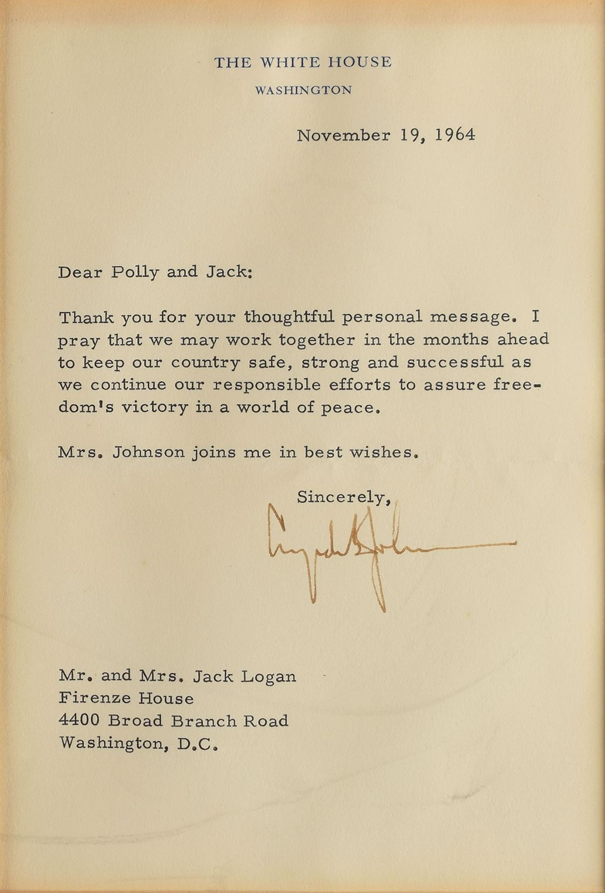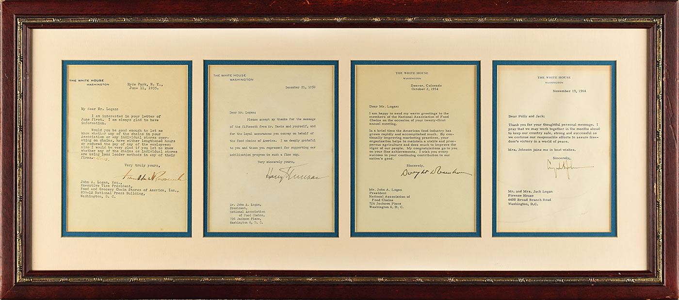 Three TLSs as president, signed by Franklin D. Roosevelt, Harry S. Truman, and Dwight D. Eisenhower, each one page, White House letterhead, dated 1935–1954; also includes a secretarially signed letter from LBJ. All to John A. Logan of the National Association of Food Chains.