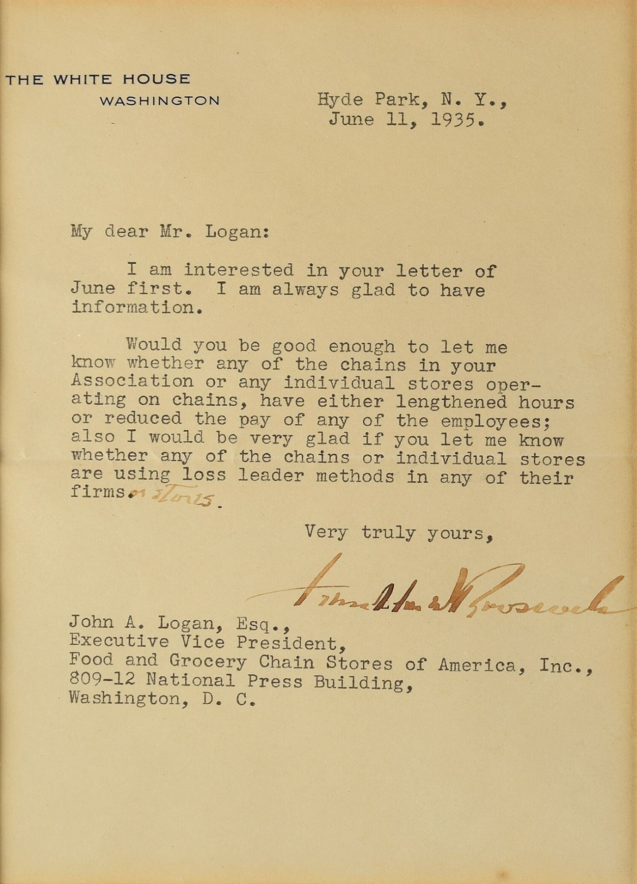 FDR's letter, in part: "Would you be good enough to let me know whether any of the chains in your Association or any individual stores operating on chains, have either lengthened hours or reduced the pay of any of the employees; also I would be very glad if you let me know whether any of the chains or individual stores are using loss leader methods in any or their firms or stores."