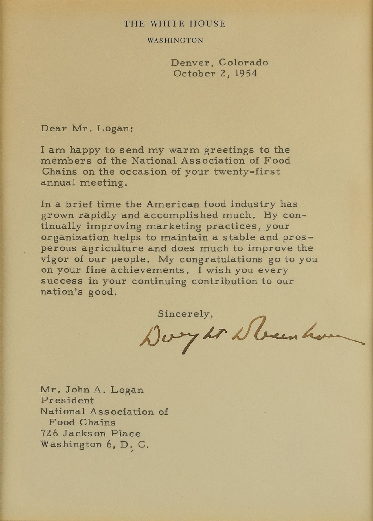 Eisenhower's letter, in part: "In a brief time the American food industry has grown rapidly and accomplished much. By continually improving marketing practices, your organization helps to maintain a stable and prosperous agriculture and does much to improve the vigor of our people. My congratulations go to you on your fine achievements. I wish you every success in your continuing contributions to our nation's good."