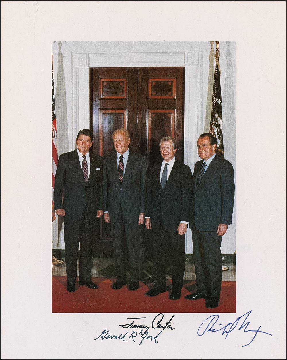 Color 8 x 10 cardstock photo of Presidents Nixon through Reagan gathered at the White House prior to departing for Anwar Sadat’s funeral in 1981, signed in black felt tip, “Gerald R. Ford,” and “Jimmy Carter,” and in blue ink, “Richard Nixon.” In very fine condition. Pre-certified PSA/DNA and RRAuction COA.
