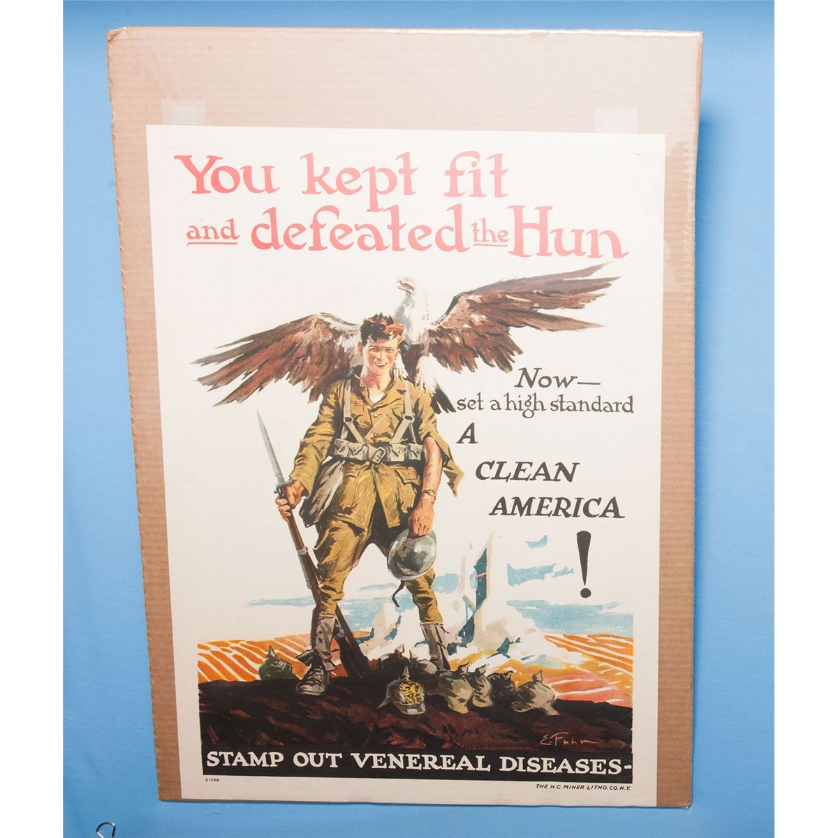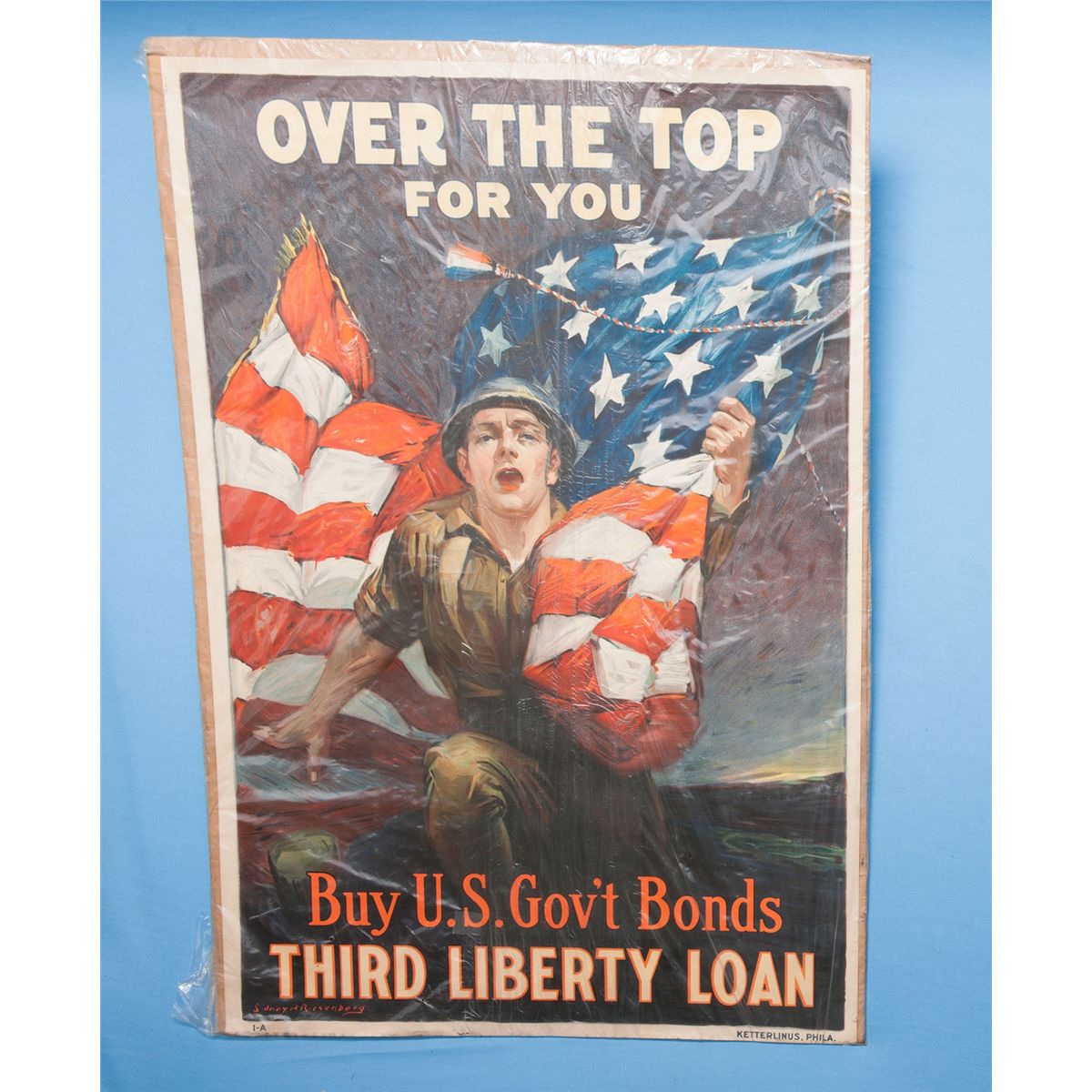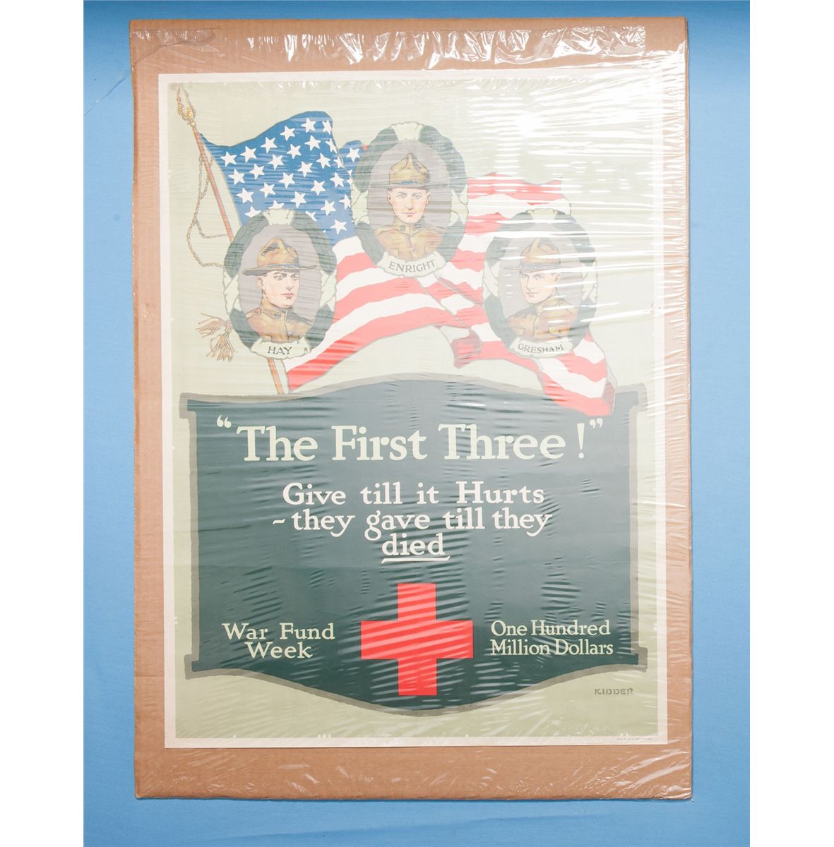 1) "The First Three!" "Give till it Hurts," "they gave till they died," "War Fund Week-One Hundred Million Dollars"designed by Kidder and measures 20x28. 2) "You kept fit and defeated the Hun," "Now set a high standard," "A Clean America! Stamp Out Venereal Diseases" designed by E. Fuhr and measures 20x28. 3) "Over The Top For You," "Buy U.S. Gov't Bonds," "Third Liberty Loan" designed by, Sidney Reisenberg and measures 20x30. CONDITION: Very good plus overall.