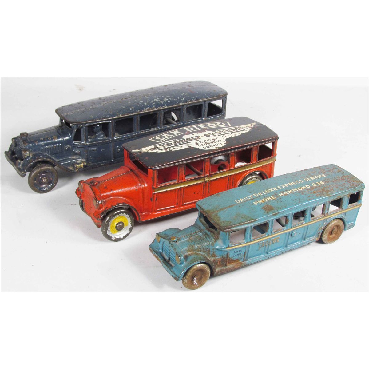 Three Promotional Cast Iron Toy Buses. San Diego Transit System, Daily DeLuxe Express and Coast to Coast. Good to very good condition. 9 3/4 to 8 inches each.