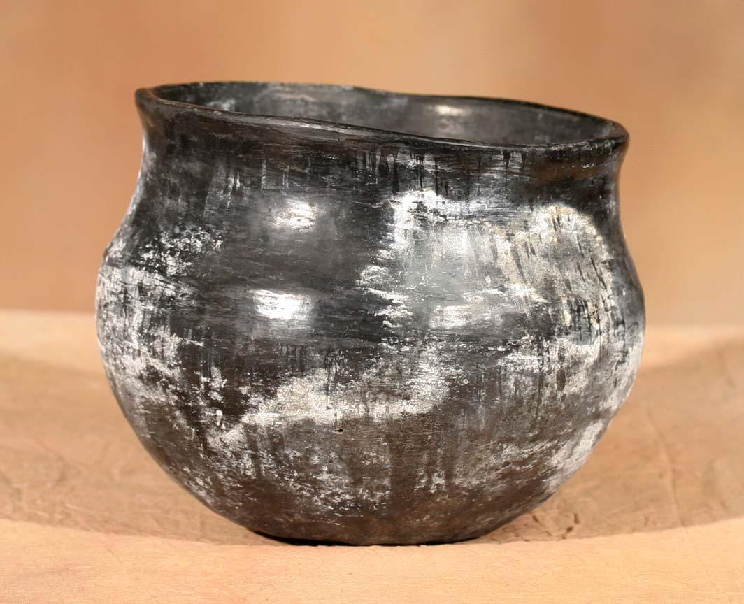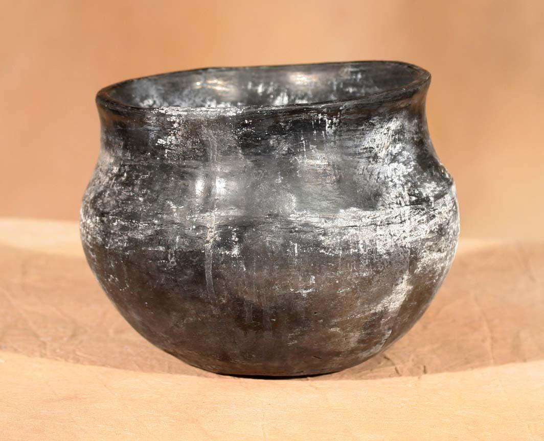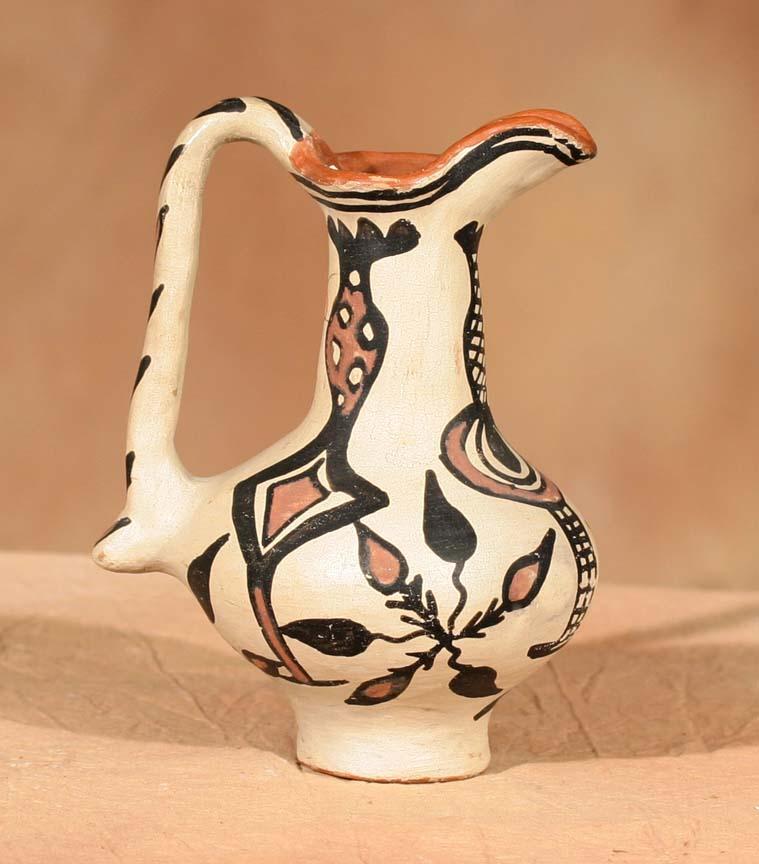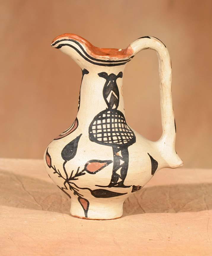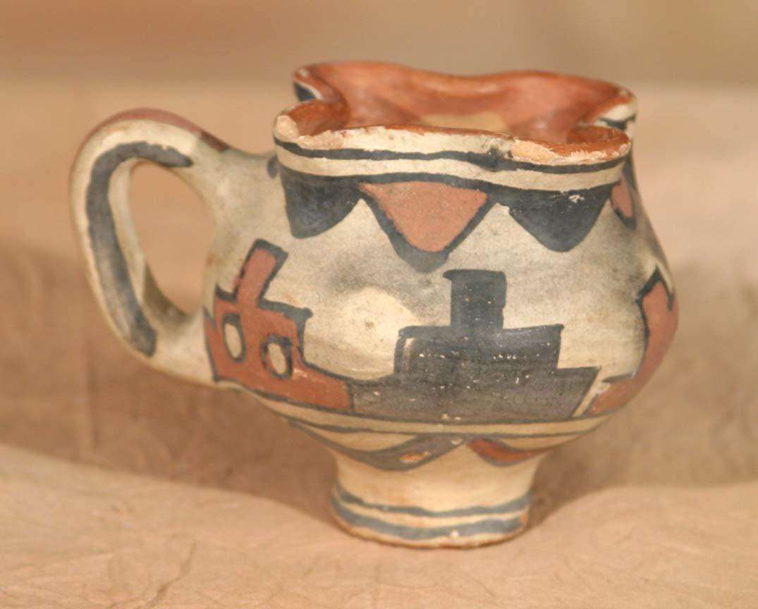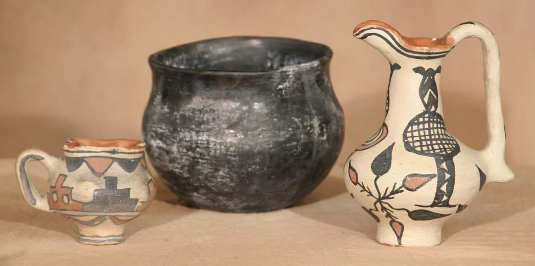 Three Pueblo Pottery Pieces. 1) San Ildefonso Cup. 3 ½" x 3 ½" x 4". Footed, fluted polychrome cup. Circa 1890. 2) San Juan/Santa Clara Blackware Jar. 5 ½" x 6 ½". No designs-shows ethnographic use. Circa 1890. 3) Santo Domingo Polychrome Pitcher. 7" x 5 ½". Red-slipped mouth with footed base, floral designs. Circa 1900. (est $900-1,400). . For condition reports please visit: www.auctioninsantafe.com/cr2011.pdf