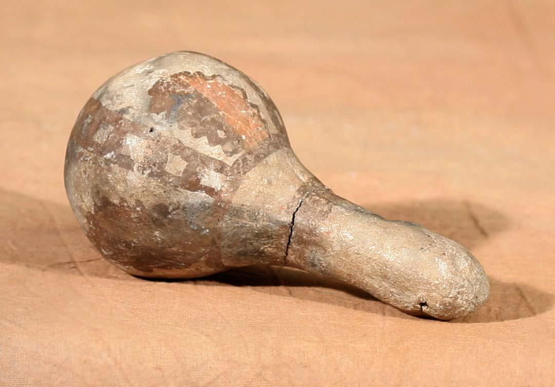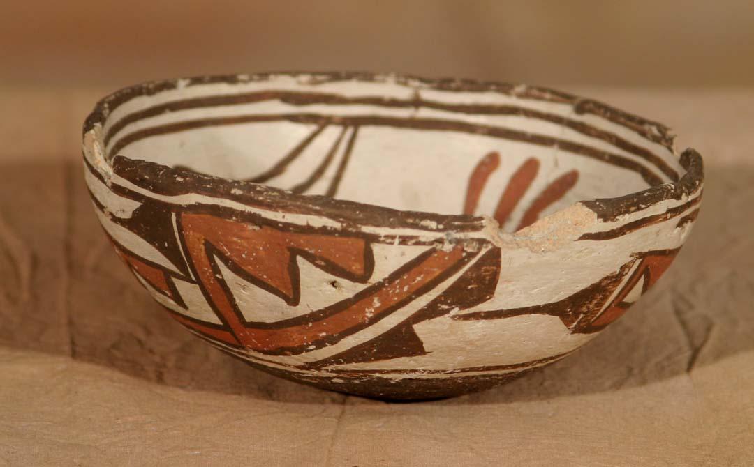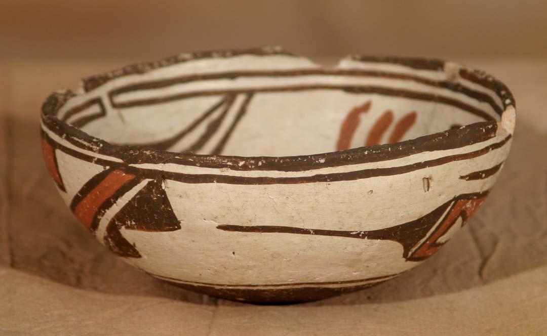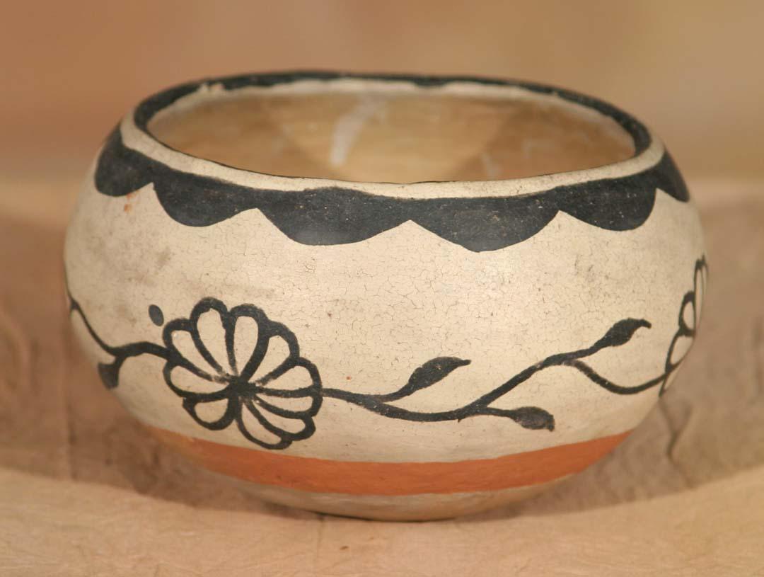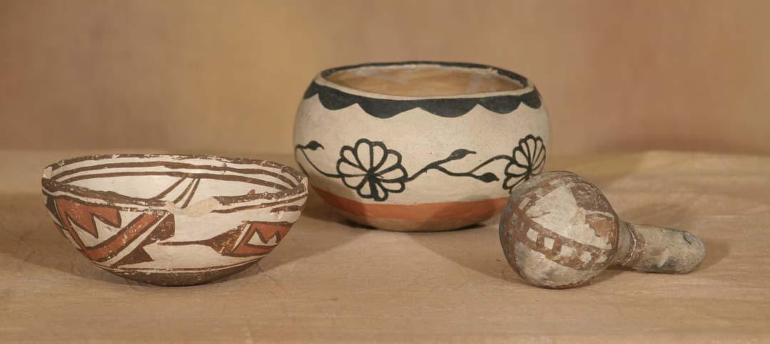 Three Pueblo Pottery Pieces. 1) Zuni Polychrome Bowl. 2 ¼" x 5 ¼". Circa 1890. 2) Cochiti Polychrome Bowl. 3 ½" x 5 ½". Floral designs, nice craquelured surface. Circa 1890. 3) Old Pueblo Ceramic Rattle. Probably Zuni, but uncertain. 4 ¾" x 2 ¼". Circa 1890. (est $600-1,200). Provenance: Bethany College, Lindsborg, KS. . For condition reports please visit: www.auctioninsantafe.com/cr2011.pdf
