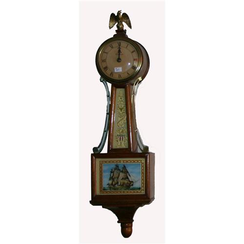 Three- Quarter Sized Telechrom Banjo Clock. Measures approximately 5 ½" x 20" T. Decorated with sailing ship and eagle finial. Electric.