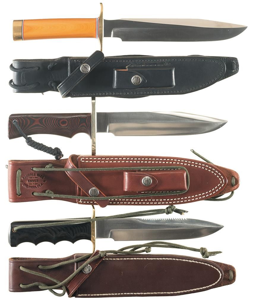 All Three Knives comes with micarta grips, Randall marked leather sheath, paracord tie-downs, and a cloth Randall pouch. 1) Randall Model 1-8 All Purpose Fighting Knife, 13" overall with an 8" carbon steel blade, brass guard and cap, light brown grip and a sharpening stone. 2) Randall Model 16 Diver Knife, 11 3/4" overall, 7" stainless sawback blade, brass guard, finger grooved black grip, "16w" marked sheath. 3) Randall Model 14 Attack Knife, 12" overall with a 7 1/4" stainless blade, nickel silver guard and single-finger multi-colored grip. Excellent overall.