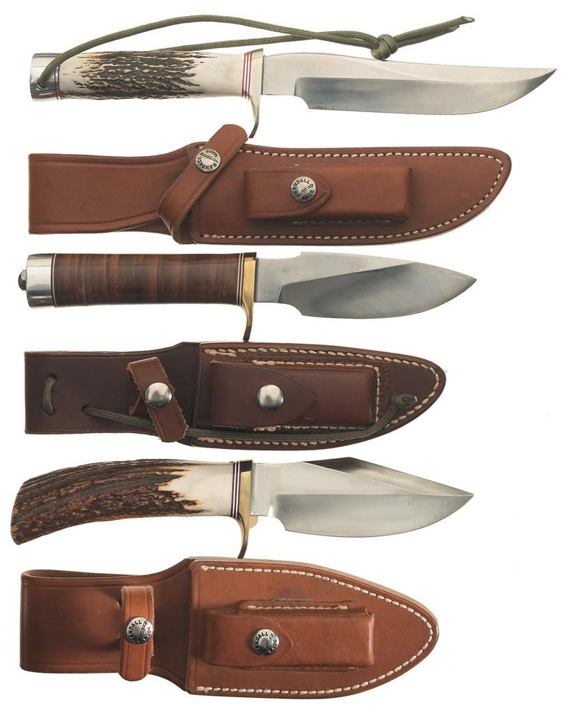 All three knives have carbon steel blades, single quillion guard, and brown leather Randall sheaths with sharpening stones. 1) Randall Model 3-6 Hunter, 10 3/4" overall, 6" blade, nickel silver guard, stag grip with red and alloy spacers, alloy pommel and green paracord wrist loop. Mild spotting on blade and guard. 2) Randall Model 11-4.5 Alaskan Skinner, 9 1/2" overall, 4 1/2" blade with thumb serrations, brass guard, straight washer grip, alloy pommel and paracord tie-down. Spotting on blade. 3) Randall Model 19-4 Bushmaster, 9 1/4" overall with a 4 1/2" blade, 2 3/4" sharpened false edge, thumb serrations, brass guard and stag grip. Light spotting on #1 and #2, otherwise excellent overall.