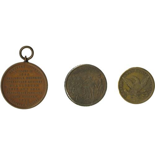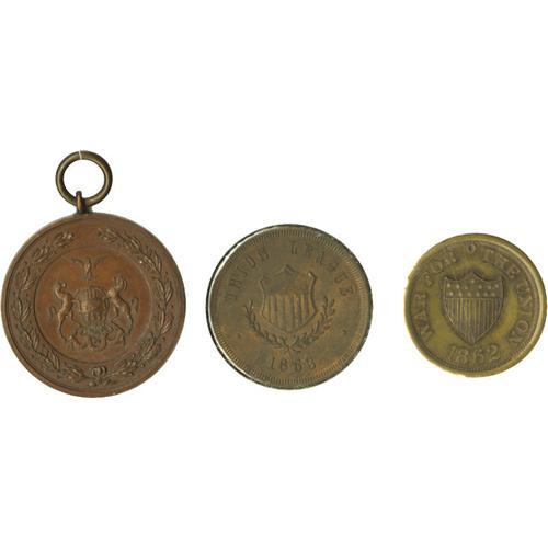 <B>Three Very Rare Bronze Civil War Medals and Mulings.</B></I> Included are: An anonymous bronze medal designed to be issued to Pennsylvania Civil War veterans (reverse portrays Pennsylvania coat of arms). Indicates muster in 1861, mustered out 1865, and lists battles on peninsula and the Carolinas; Civil War ID tag muling - War of the Union / Shield / 1862, ID blank, combined eagle, United States of America storecard reverse; Union League 1863 / Wm. Penn and Indians dies in odd muling (obverse of Rulain Pa. A255), all are AU-UNC. 3 pieces.