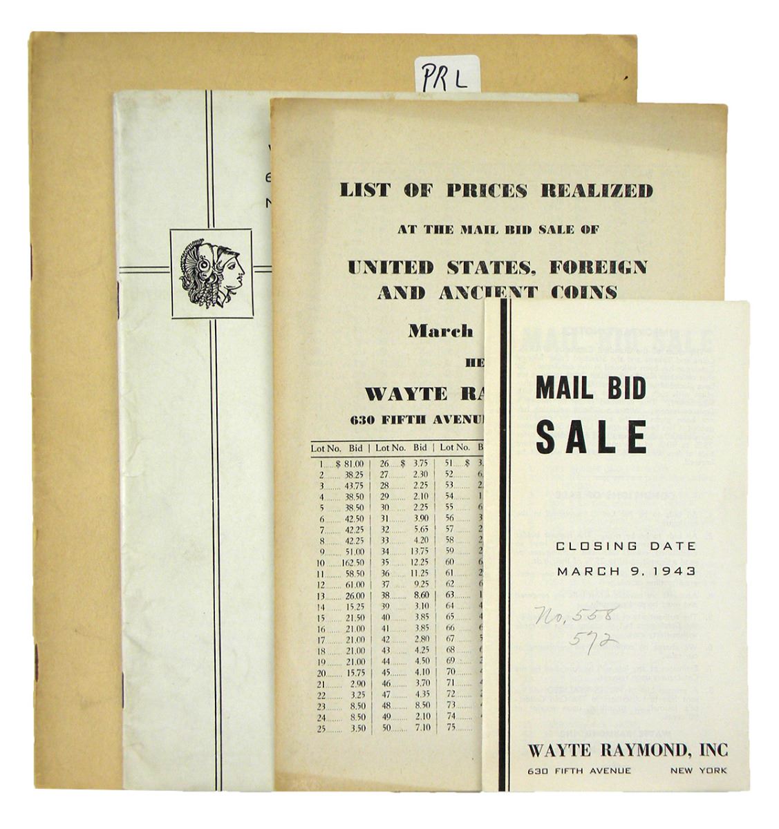 Raymond, Wayte. MAIL-BID CATALOGUES. Three numismatic mail-bid sales. New York: Mar. 21, 1939; Mar. 9, 1943; and Sept. 12, 1944. Varying formats, original printed covers. Second sale includes prices realized list. Fine or nearly so. Adams 29, 56 and 60.