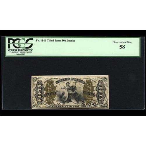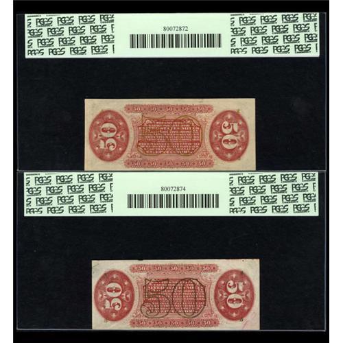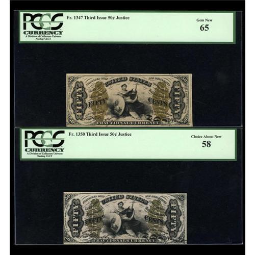 <B>Three Red Back Justices.</B></I> Fr. 1346 50c PCGS <B>Choice About New 58</B></I>, Fr. 1347 50c <B>Gem New 65 </B></I>and Fr. 1350 50c PCGS <B>Choice About New 58</B></I>.<BR><I>From The Thomas M. Flynn Collection</B></I><BR><BR><b>Shipping:</b> Coins & Currency (<a target="_blank" href="http://www.heritageauctions.com/common/shipping.php">view shipping information</a>)