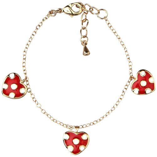 Three Red Enamel Hearts With White Dots-Gold Plated Brass Bracelet- 4" 1"