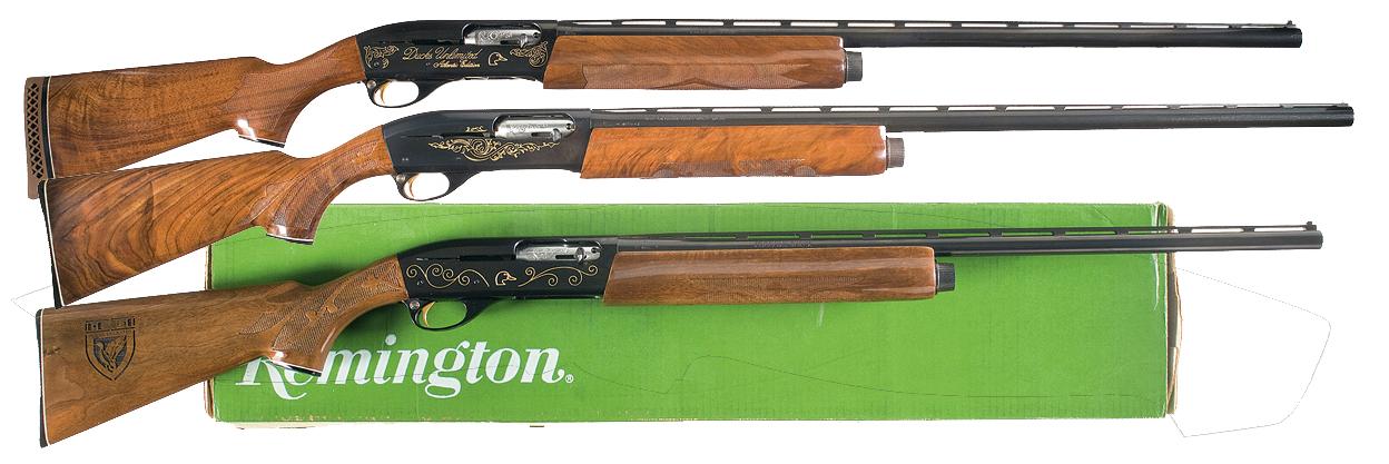 A) Commemorates our nation's waterfowl flyways circa 1981/1982, with standard Model 1100 features, 3 inch chamber, choked full. Commemorative Ducks Unlimited gold filled engravings designed by David A. Maass and a brass oval medallion mounted to the left receiver side. Gold washed trigger and highly figured checkered forend and pistol grip stock with black and white diamond grip cap and vented Remington recoil pad. With green hard sided locking carrying case with magazine plug and manual.