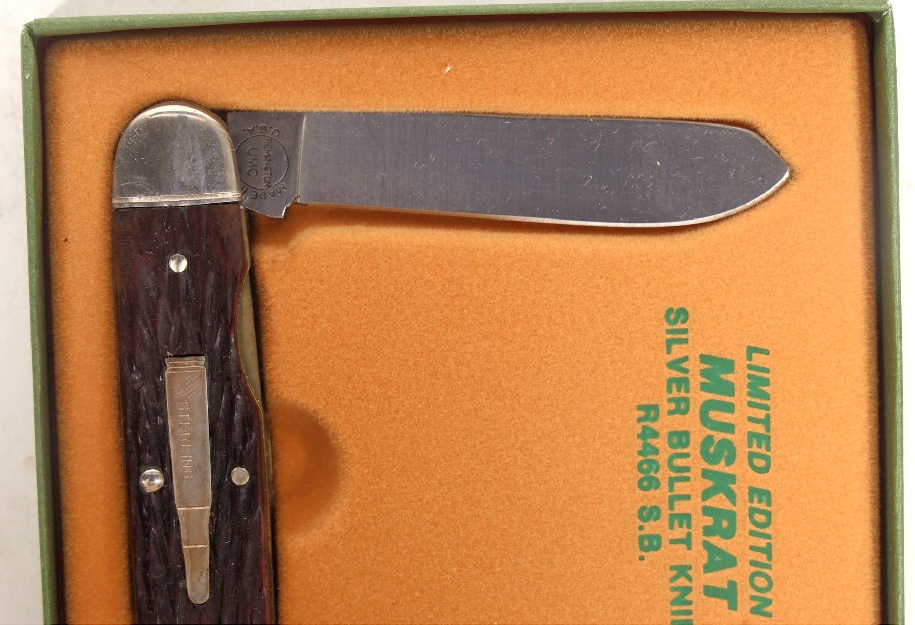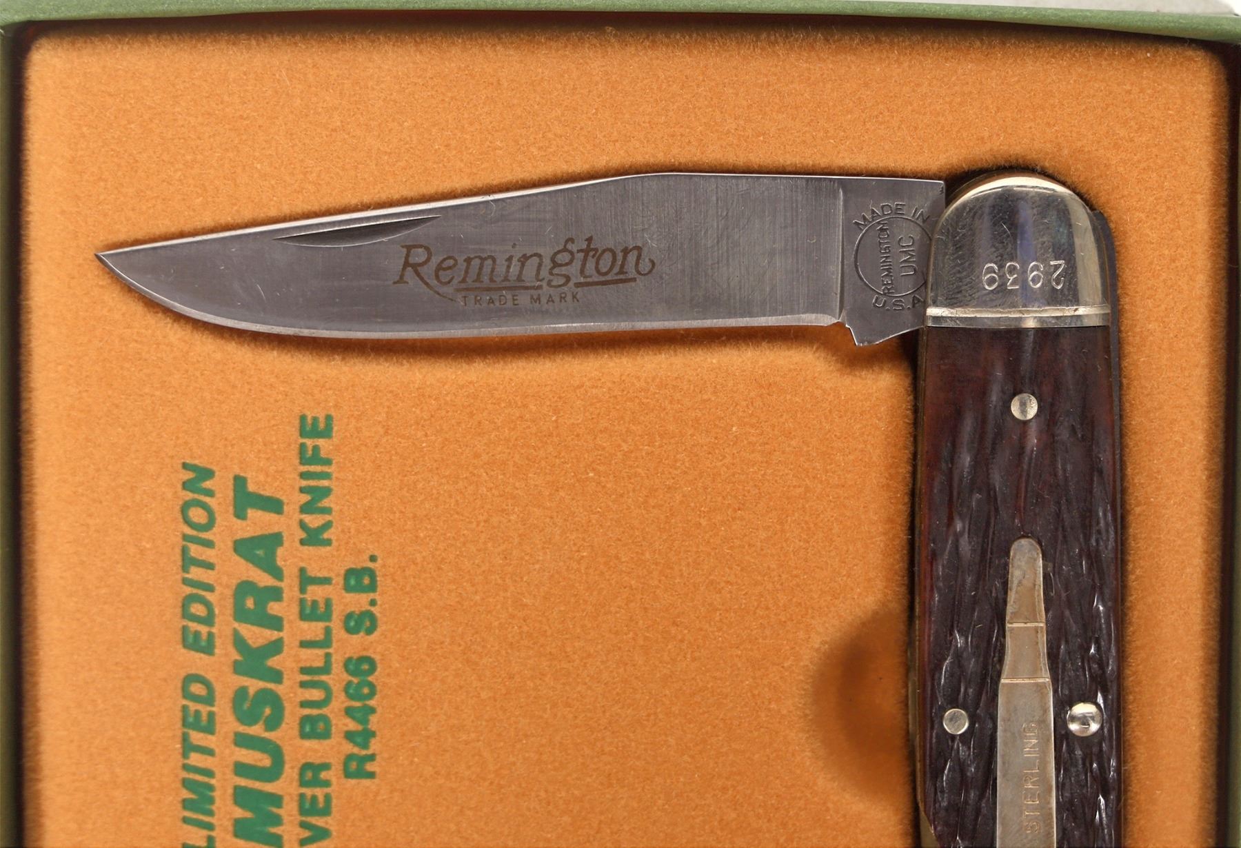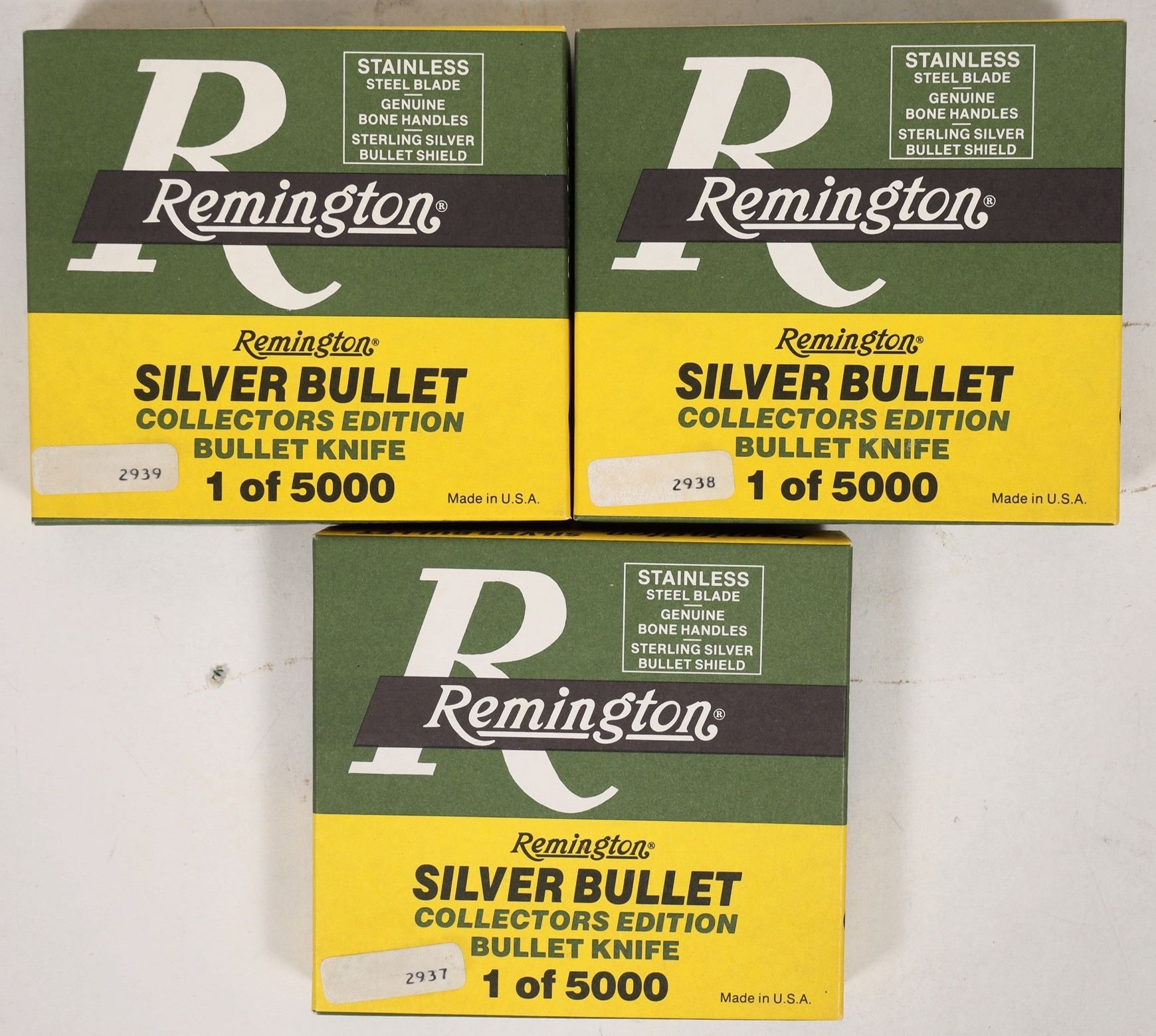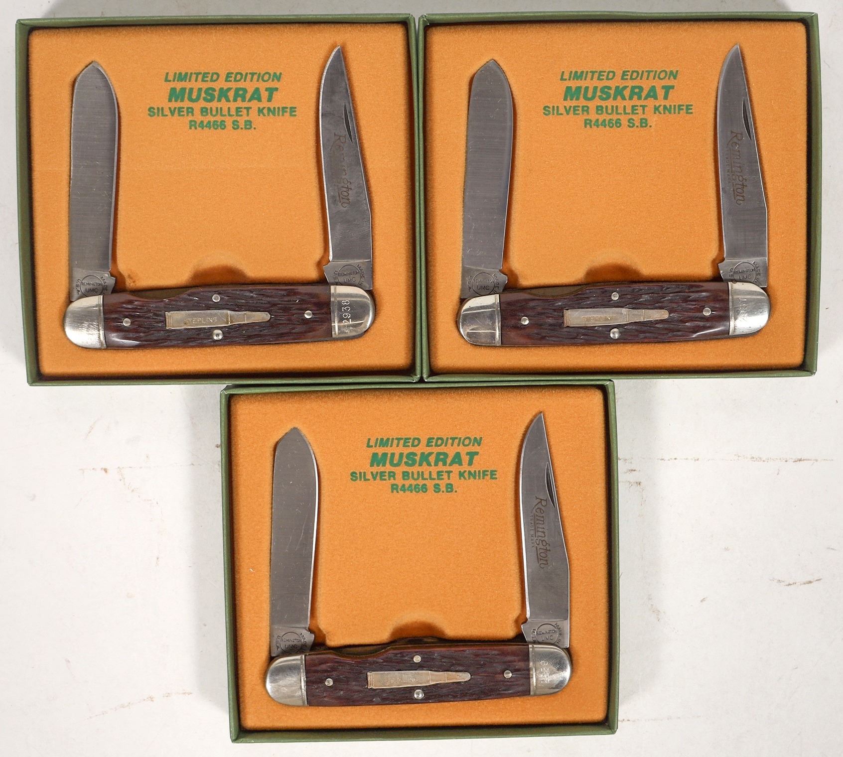 These are three Remington Silver Bullet knives Model R4466 SB Muskrats NIB (3) 1988. Jigged bone scales, new in the boxes, paperwork included, factory edges. Consecutive S/N 2937/2938/2939. Limited Editions 1 0f 5000. Please see photos for details. _x005F_x000D_
