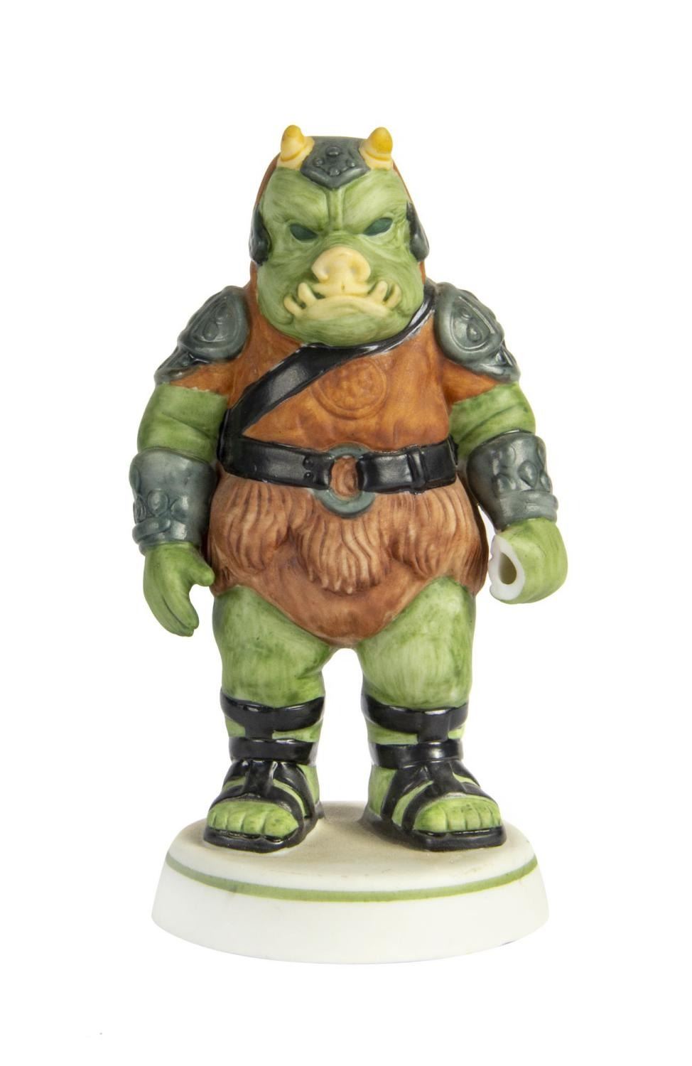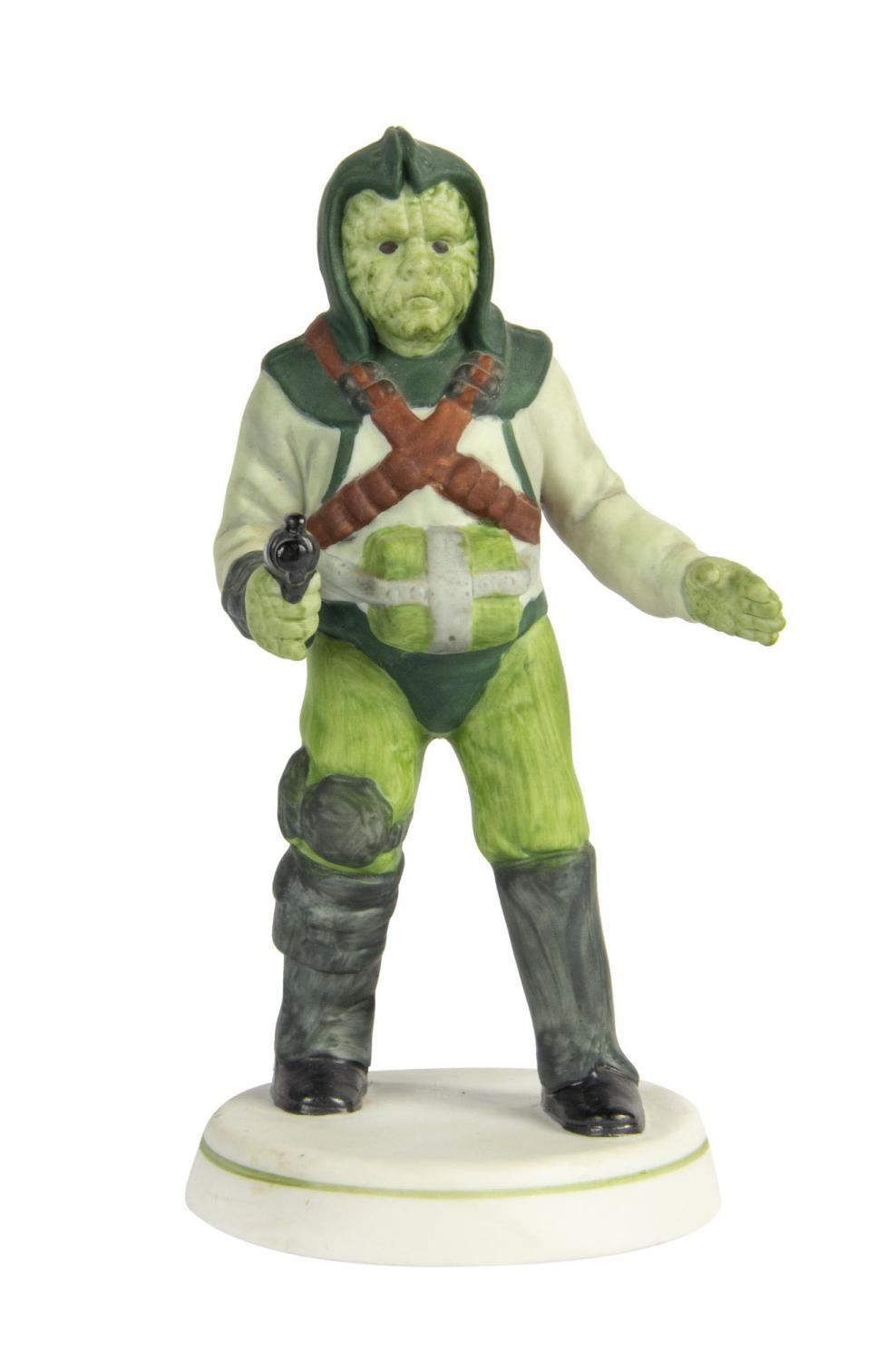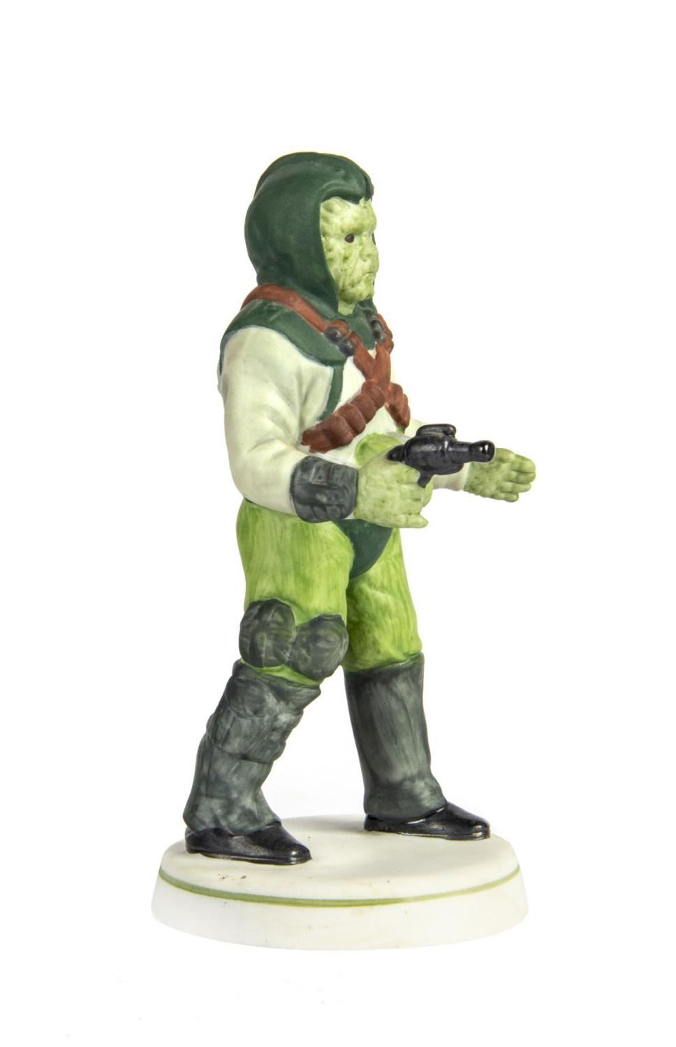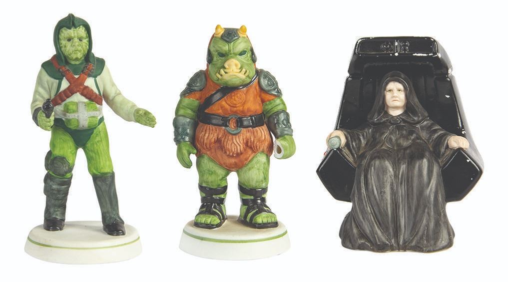 (Sigma, 1983) Three hand-painted ceramic figurines from "Return of the Jedi,” including the Emperor, Klaatu, and a Gamorrean Guard. Ranging in size from 2.5” x 2.5” x 5.25” to 3.5” x 4.25” x 5.25”, the figurines display in fair to very good condition with scuffs, particularly the Emperor with paint loss, and the Guard’s axe and part of the left hand have broken off and are not included.
