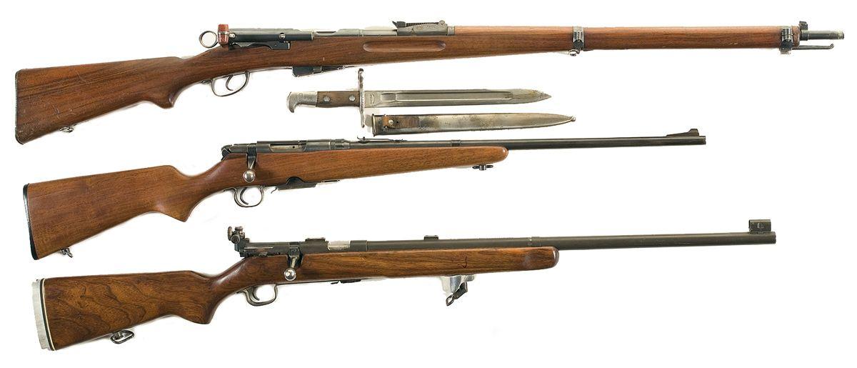 A) Manufactured between 1913 and 1919 with standard Swiss proofs and military sights. Moderate scratches and nicks throughout stock. Complete with "Waffenfabrik" marked bayonet and metal scabbard.