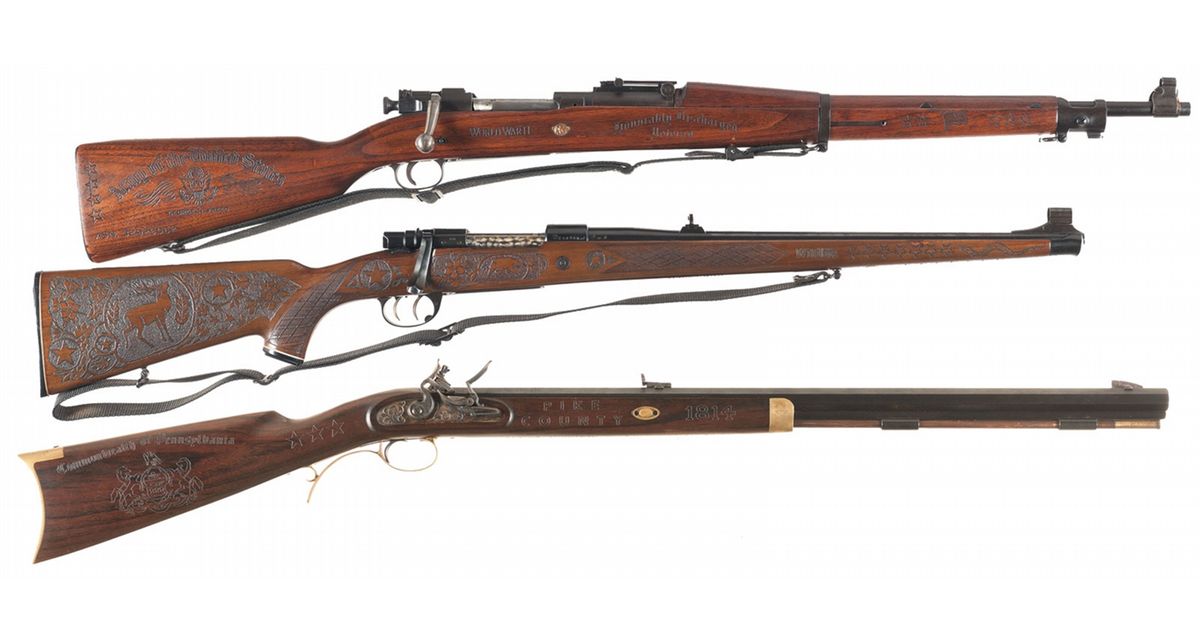 Three Rifles and One Pistol, All George Freed Engraved/Carved