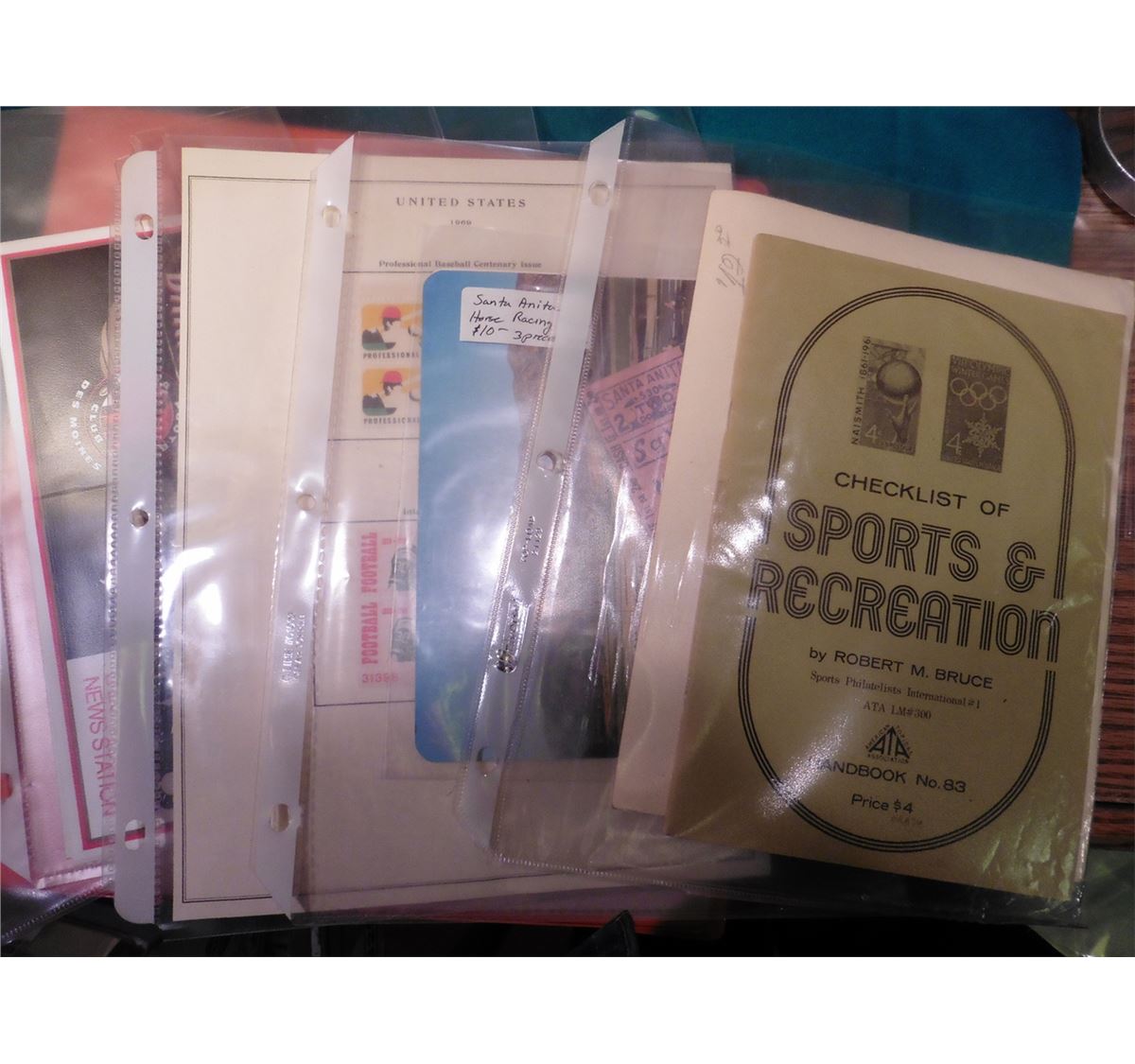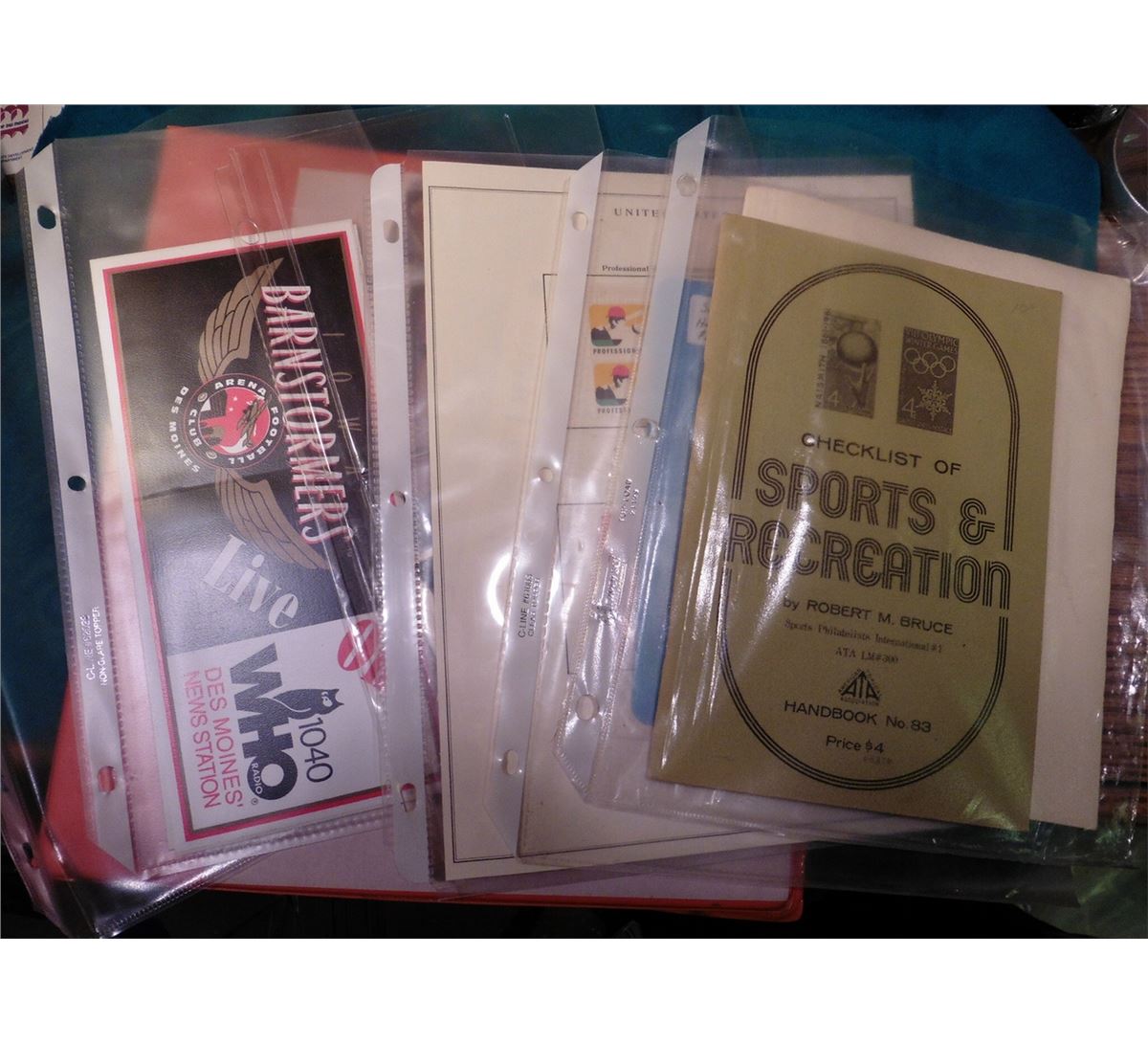 Three Ring Notebook with Good Sports (non Baseball) Paper Items. Includes “Checklist of Sports & Recreation”, by Robert M. Bruce; photo of Pool Ball players on an antique table; (2) different post cards from Santa Anita Park; 1959 Place Ticket from Santa Anita; Block of (4) Professional Baseball Centenary Issue .06c Stamps; Block of (4)Intercollegiate Football Issue .06c Stamps; “Jamaal Wilkes” Wherehouse card; group of various Banner Stickers; 1963 Mexico Scrip; Iowa Barn Stormers Stickers; 1983-84 Houston, Texas Astrodome Brochure; & a green ribbon “Columbus Jr. High Invitational Track & Field Meet 1970 Fifth Place 100 Yd. Dash” Ribbon.