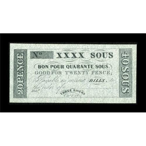 <B>Three Rivers, LC- Hart's Bank</B></I> 20p Oct. 1, 1837 Ch. # 350-10-06R<BR> An attractive remainder from this private bank. <B>Choice About Uncirculated, </B></I>new but for one corner tip fold.<BR><I>From The Thomas M. Flynn Collection</B></I><BR><BR><b>Shipping:</b> Coins & Currency (<a target="_blank" href="http://www.heritageauctions.com/common/shipping.php">view shipping information</a>)