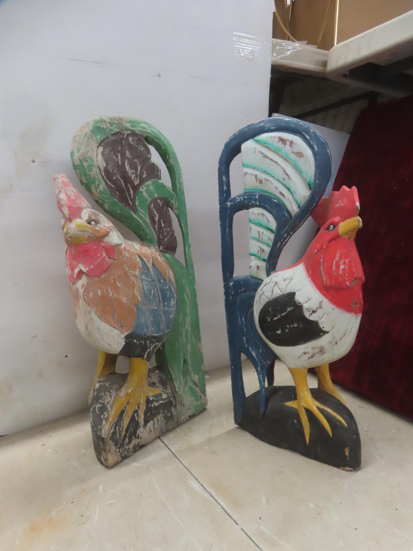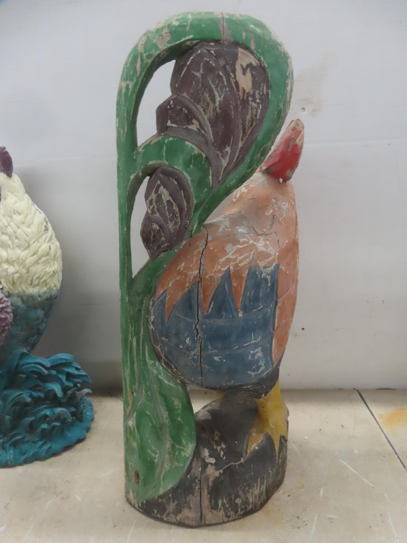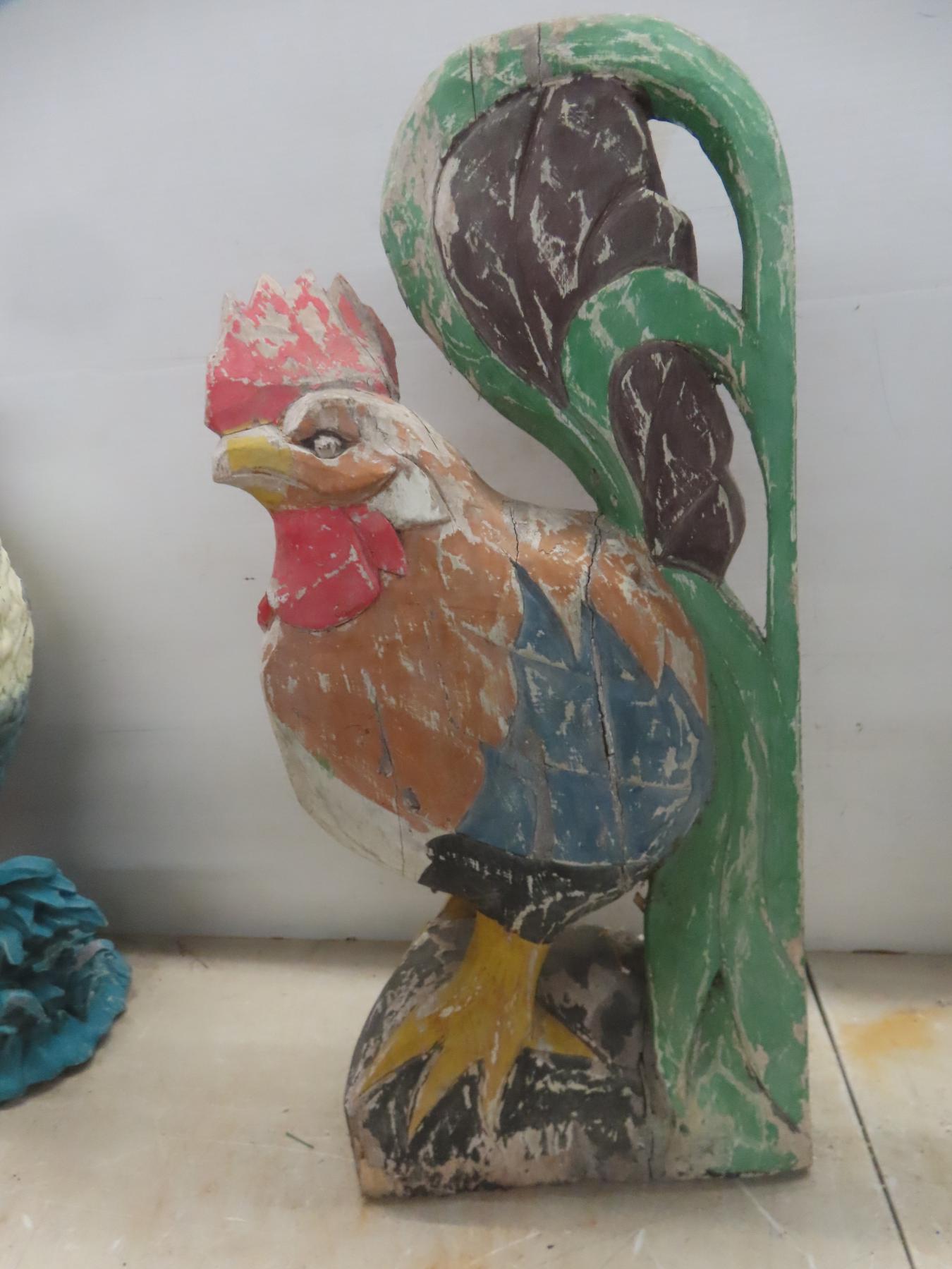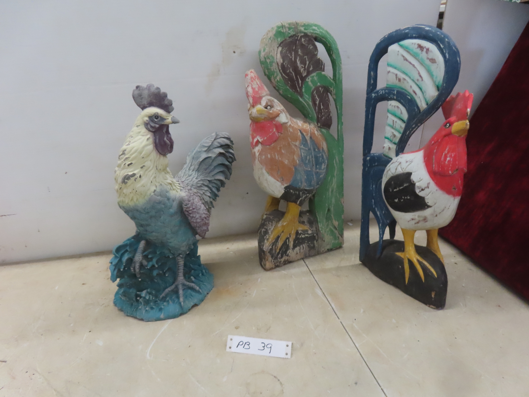 Three Rooster Figures – Two Wooden and One Resin, Tallest 20"