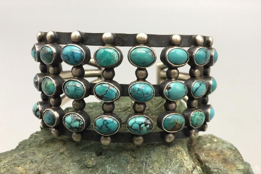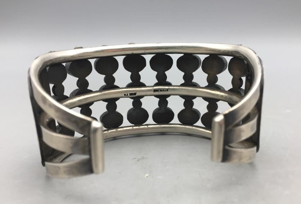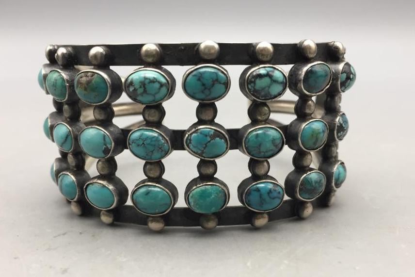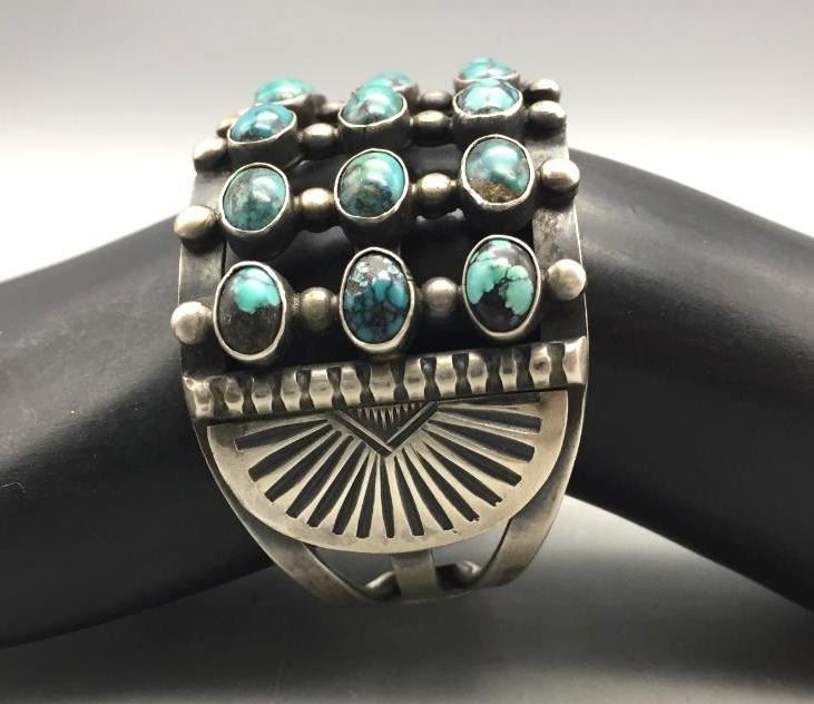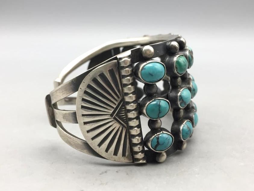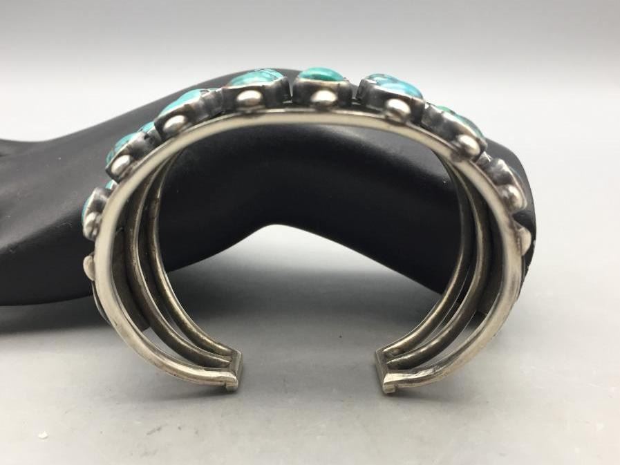 Offered for sale in this lot is a beautiful three row turquoise cluster bracelet set with 24 turquoise stones and accented with silver dots. Marked as sterling silver. Maker: P.J. Begay, Navajo. Approx. Age: Vintage to modern. Size: Inside circumference measures 5-7/8" long. Opening is an additional 1", fitting a 6-7/8" wrist. Width is 1-3/8". Weighs 66.9 grams. Condition: Good for its age, normal wear expected. Please look closely at the pictures - they are an important part of our description. Shipping: There will be a $5 handling, packaging fee for shipping this lot. The actual cost of postage will be added on top of that.