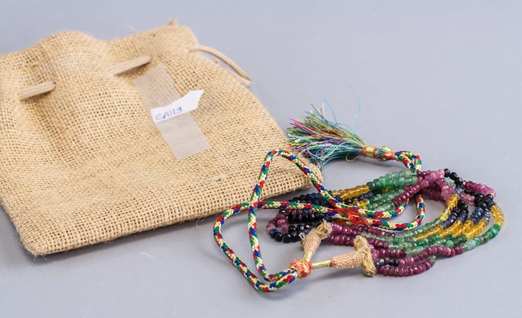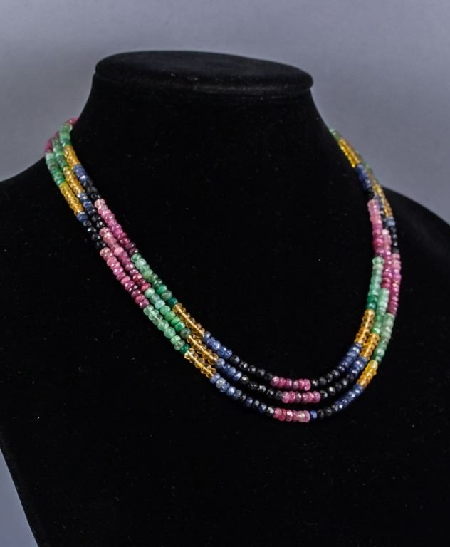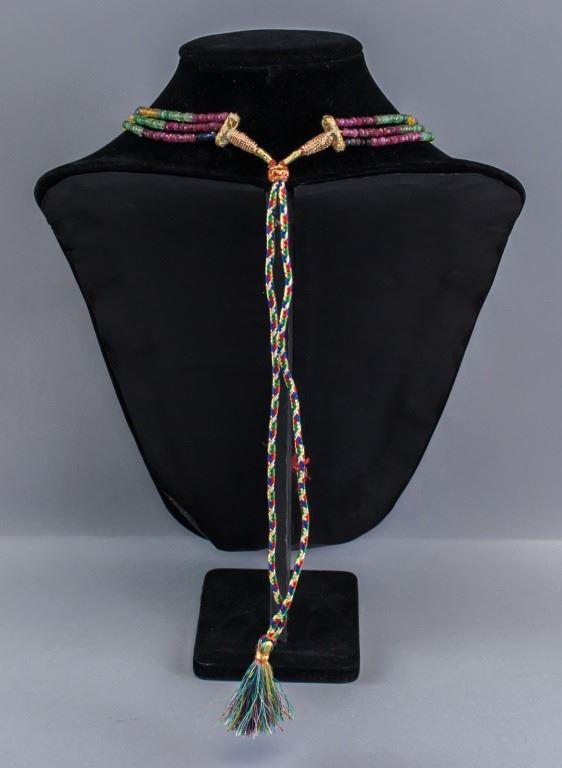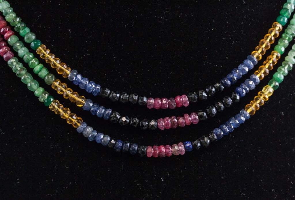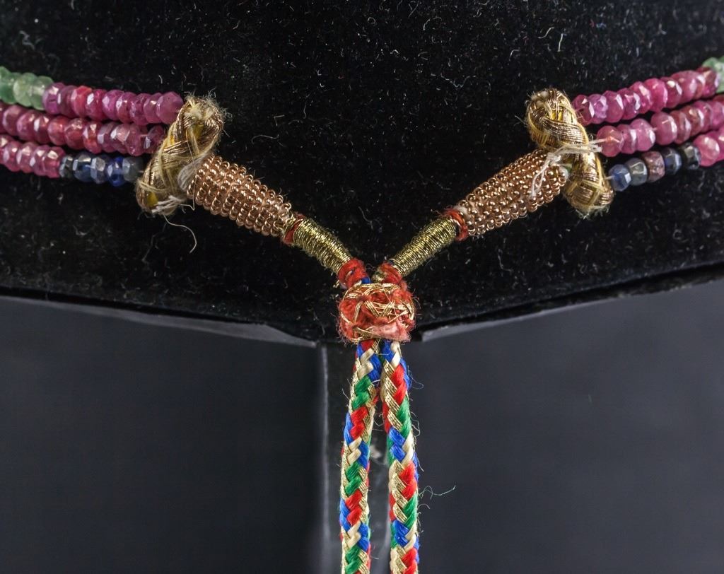 Necklace, of small rainbow colored beads. In three loops.