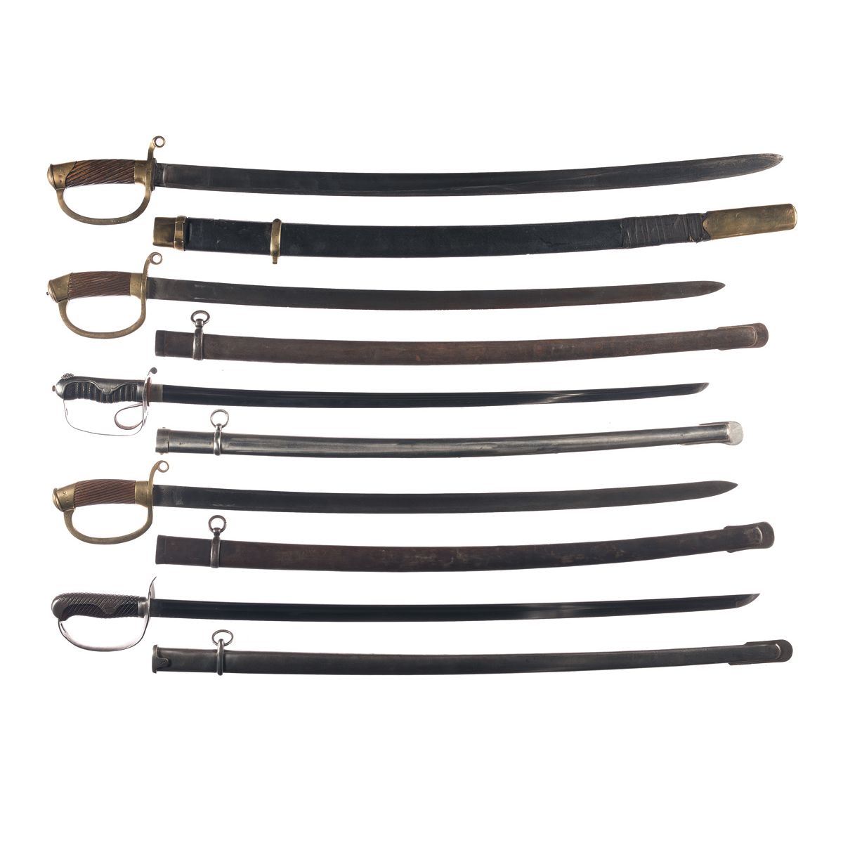 1) Shashka, 34" blade, 1898 dated guard, ribbed wood grip, leather and brass scabbard. Scabbard repaired, otherwise good. 2) Shashka, 31 1/4" blade, Farsi markings, metal scabbard. Pitted. 3) Japanese sword, 30" blade, silvered collar, leather and wire grip, metal scabbard. Very good. 4) As 2, 31" blade, good. 5) Japanese sword, 33" single fuller blade, metal guard, wood grip, metal scabbard. Scabbard fair, sword very good.
