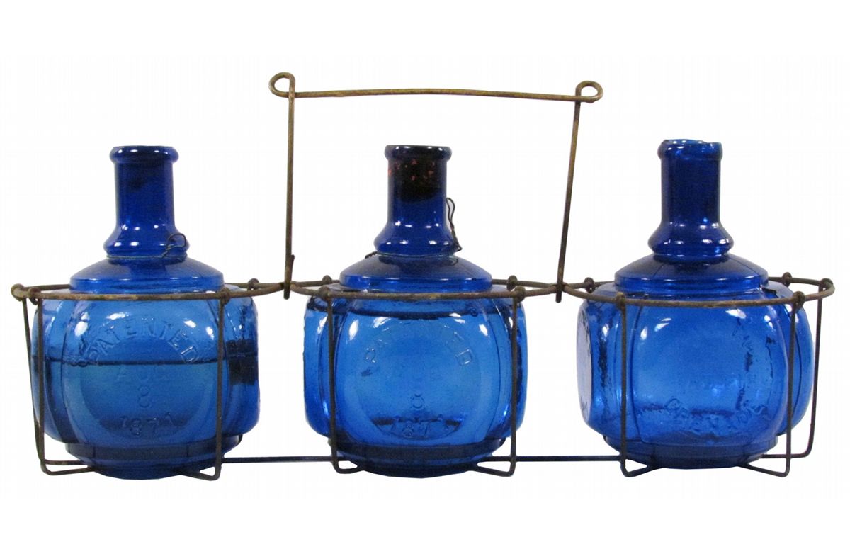 Three S.F. Hayward's Hand Fire Grenades in wire rack. Pat Aug 8, 1871. Embossed on three of four round panels. Cobalt blue. Two full with original seals and empty one has chips on lip. Each measures 6 1/2 inches tall.