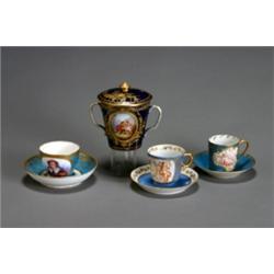 Three SFvres-Type Cups and Saucers and a Covered Cup, Late 19th-Early 20th Century, Each cup...