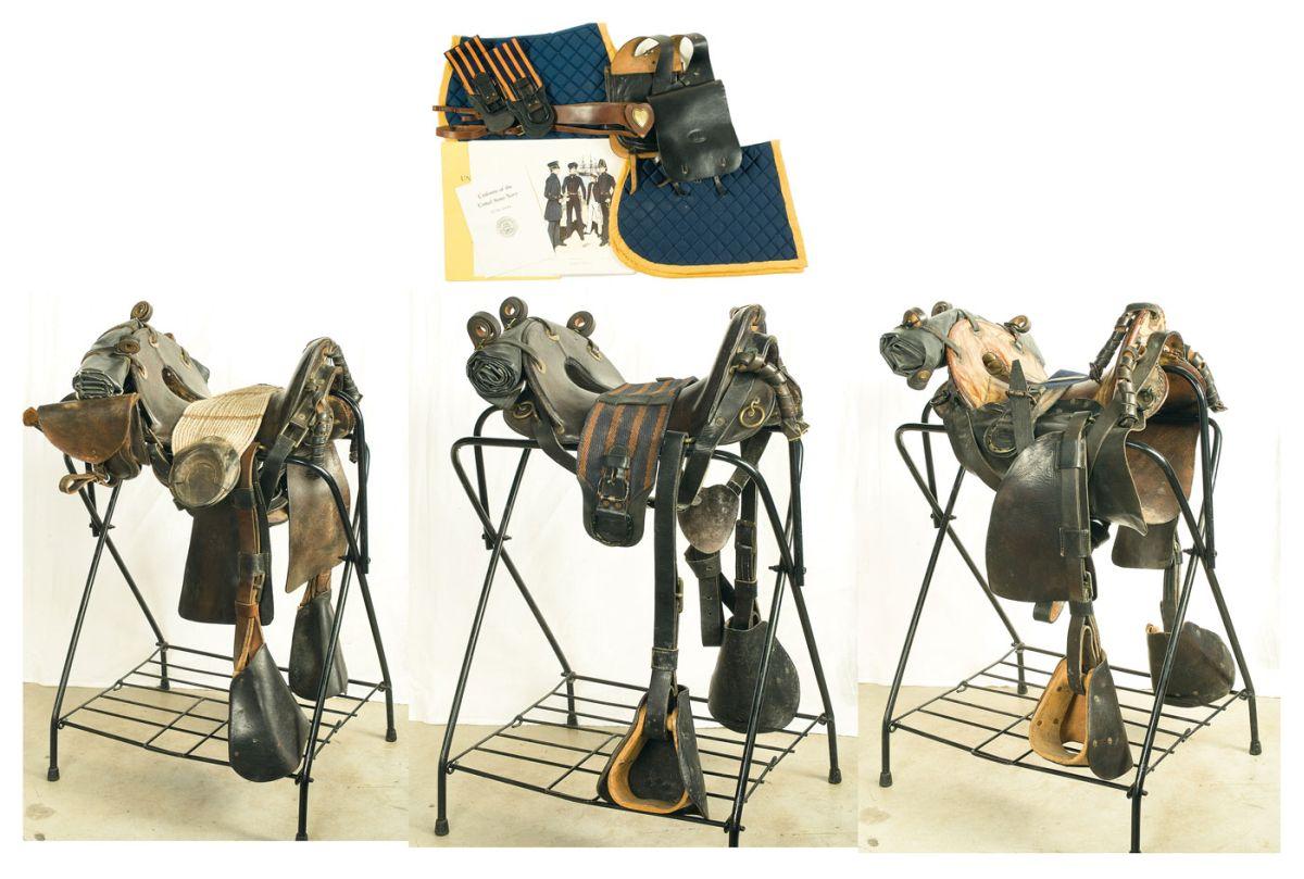 12" seat F. Burgess saddle with wooden stirrups (overall very good), 11 1/2" seat F. Burgess saddle with wooden stirrups (overall very good), 11" seat Rem's Farm Saddlery saddle with wooden stirrups (overall very good), 2 blue and yellow saddle pads, "US" embossed saddle bags.