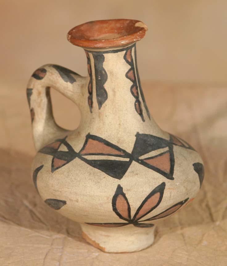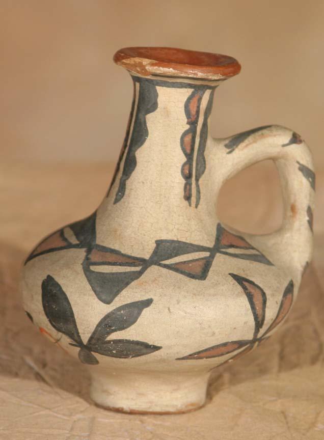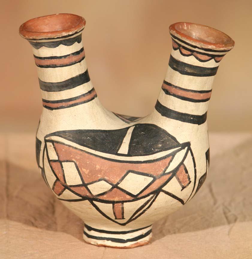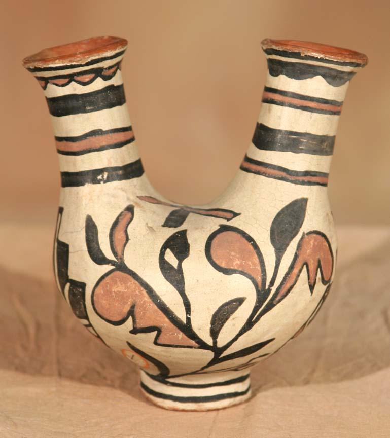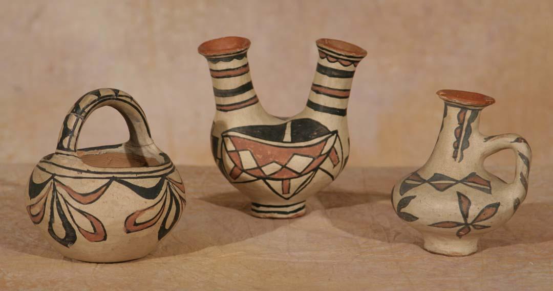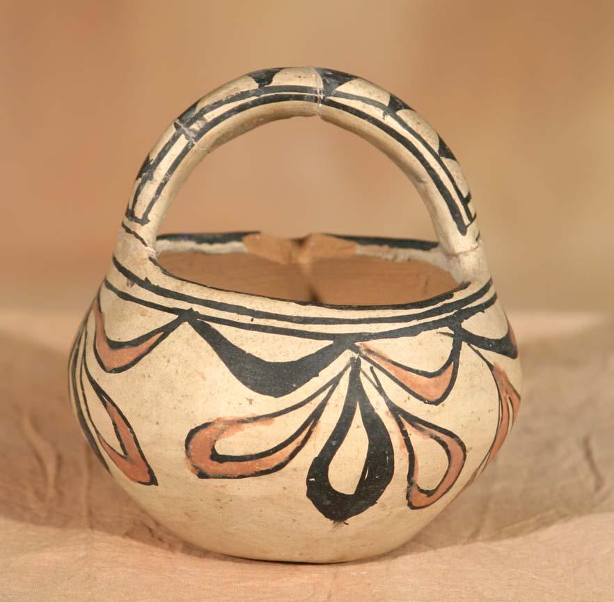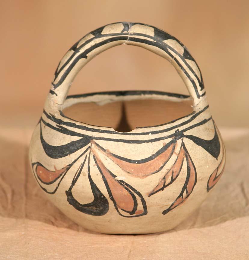Three San Ildefonso Pottery Pieces. 1) Polychrome Handled Bottle. 5 ½" x 3 ¾". Footed base and floral designs. Circa 1890-1900. 2) Polychrome Handled Basket Bowl. 4 ½" x 4 ½". Circa 1890-1900. 3) Polychrome Double-Spouted Vase. 5 ½" x 4 ½" x 3 ½". Geometric designs on this early wedding vase form. Footed base. Bears old label. Circa 1900. (est $600-1,000). Provenance: Bethany College, Lindsborg, KS. For condition reports please visit: www.auctioninsantafe.com/cr2011.pdf