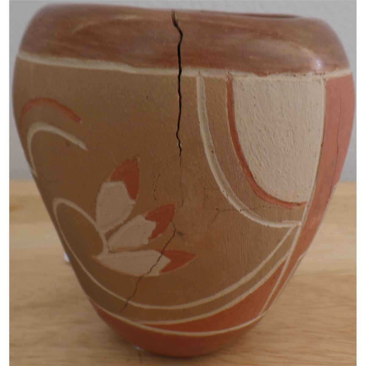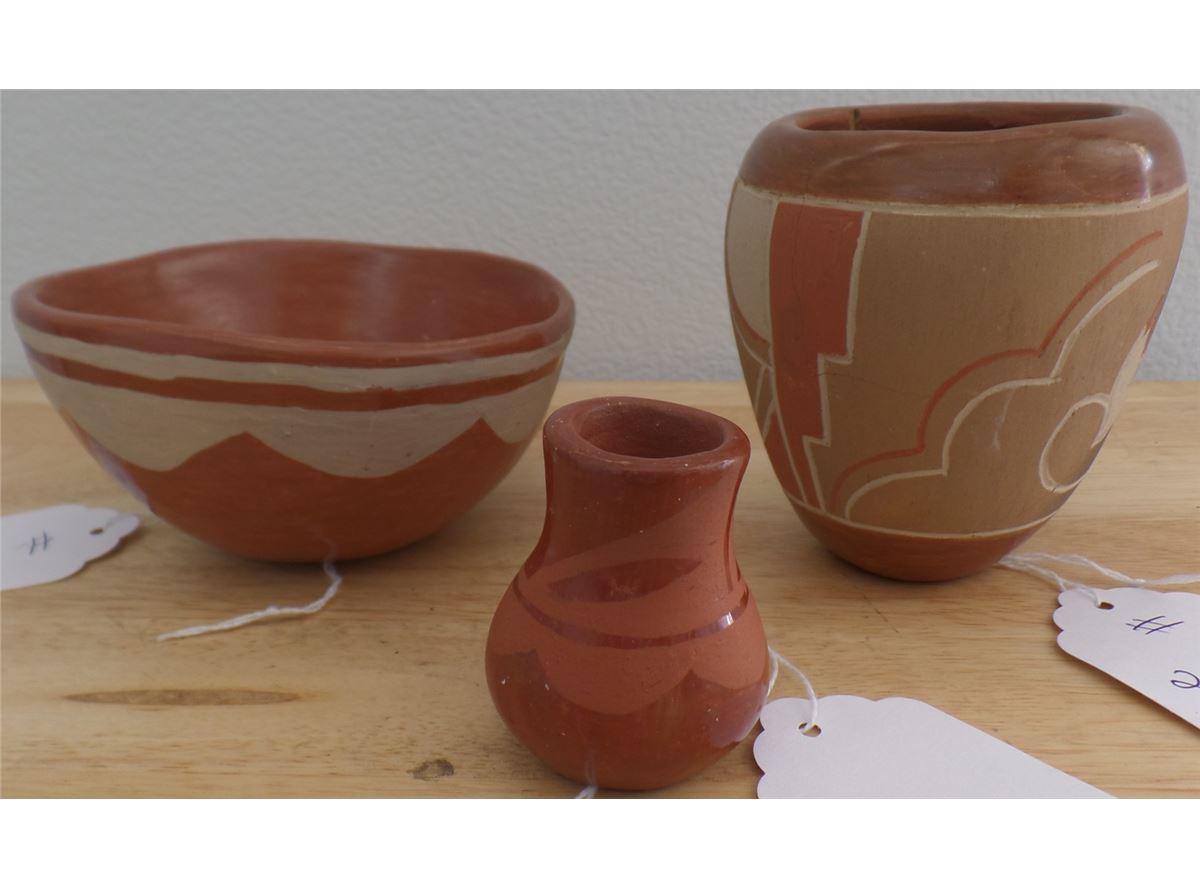 Very nice Santa Clara Pottery Vessels from the 1950's measuring 1 1/2 x 2, 3 x 4 and 2 1/2 x 4 1/2 inches. The pot measuring 3 x 4 inches has some serious cracks. See pictures. Shipping $20.00