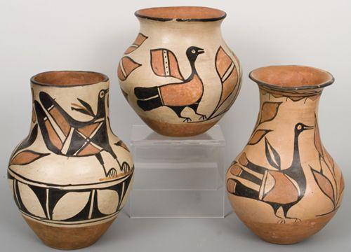 Three Santa Domingo Vases. All with bird designs. (1) 8 ¼” x 8 ¼”. Olla. Fine condition. (2) 10" x 7 ". Fine condition. (3) 10 ½” x 7" pinkish vase. Minor staining. (est $1,100-1,200)