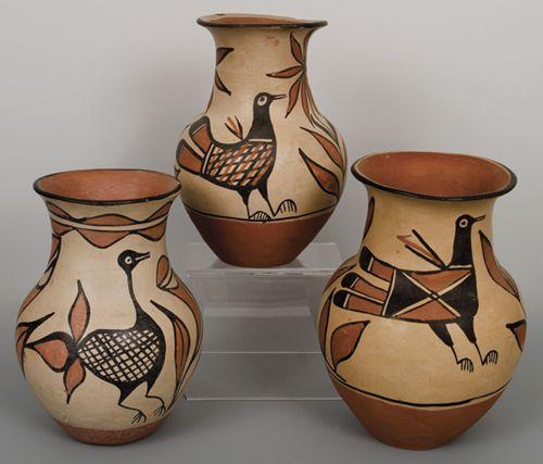 Three Santa Domingo Vases. Bird Designs. (1) 9 ½” x 6 ¾”. Rim chip. (2) 9 ½” x 6 ½”. Fine condition. (3) 10 ½” x 7". Fine condition. (est $1,200-1,500).
