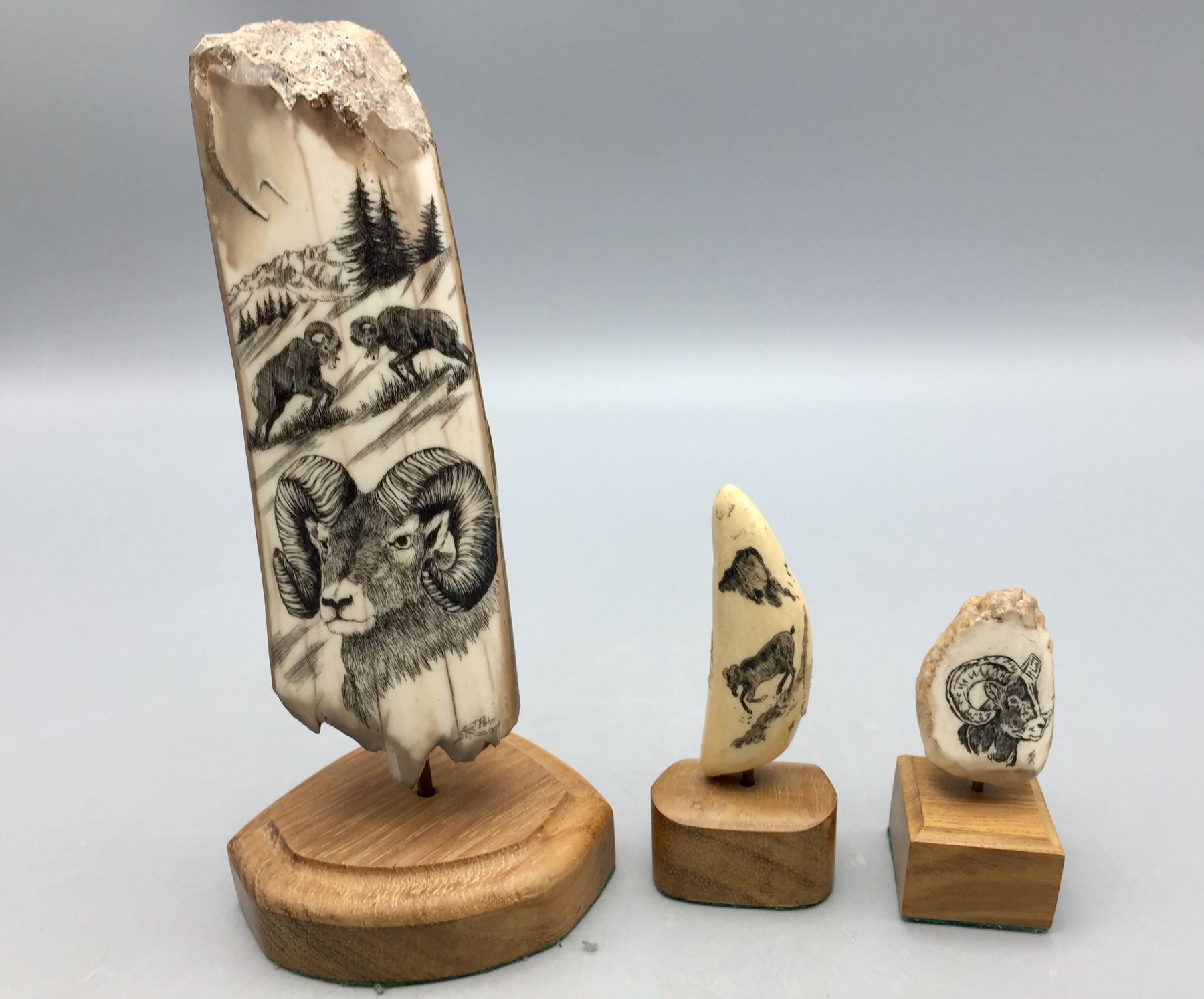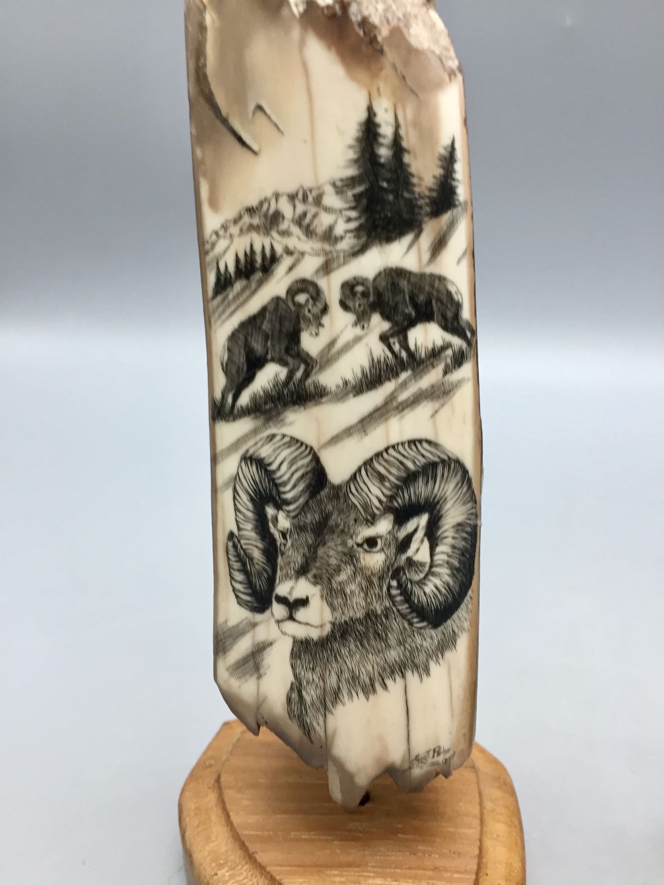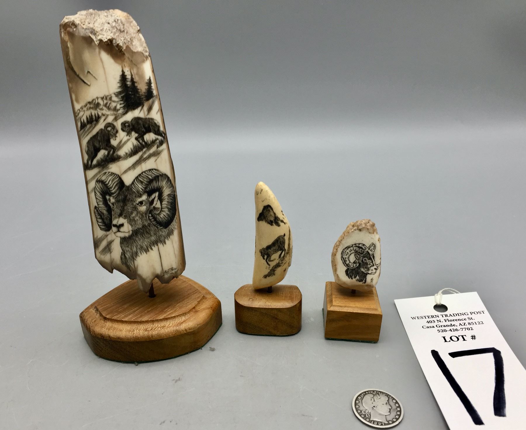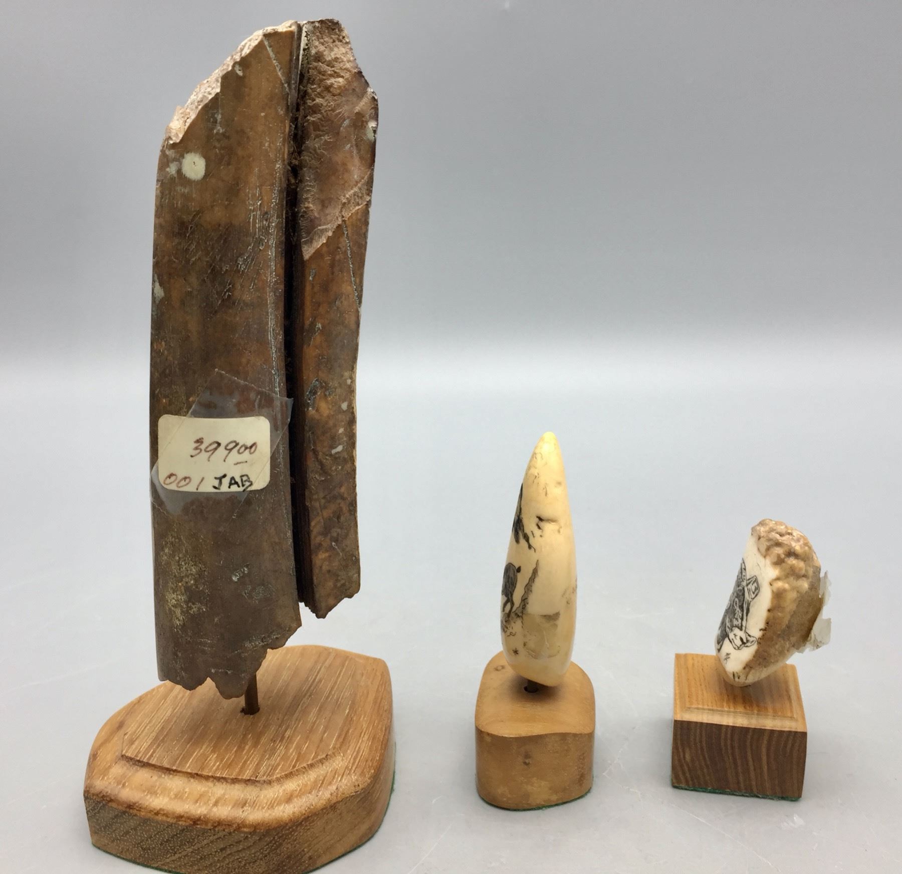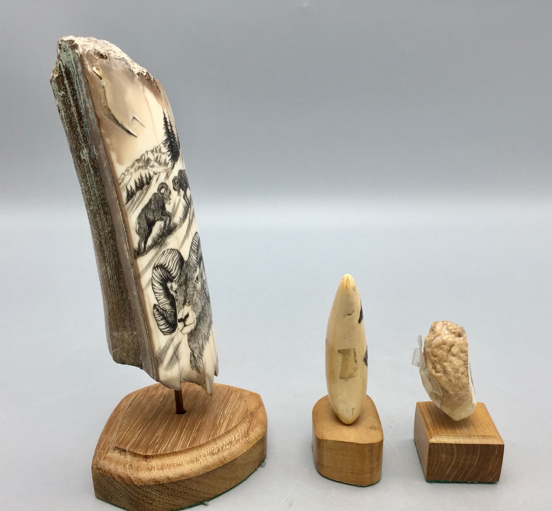 Description: Presented for sale in this lot are three Scrimshaw fossilized ivory pieces. All vary in sizes and designs. Maker: Various. Approx. Age: Ivory is fossilized (pre-historic) and the work on it is more modern. Size: 2.5” to 6.75” tall. Condition: Good for their age, normal wear expected. Please look closely at the pictures - they are an important part of our description. Shipping: There will be a $10 handling, packaging fee for shipping this lot. The actual cost of postage will be added on top of that.