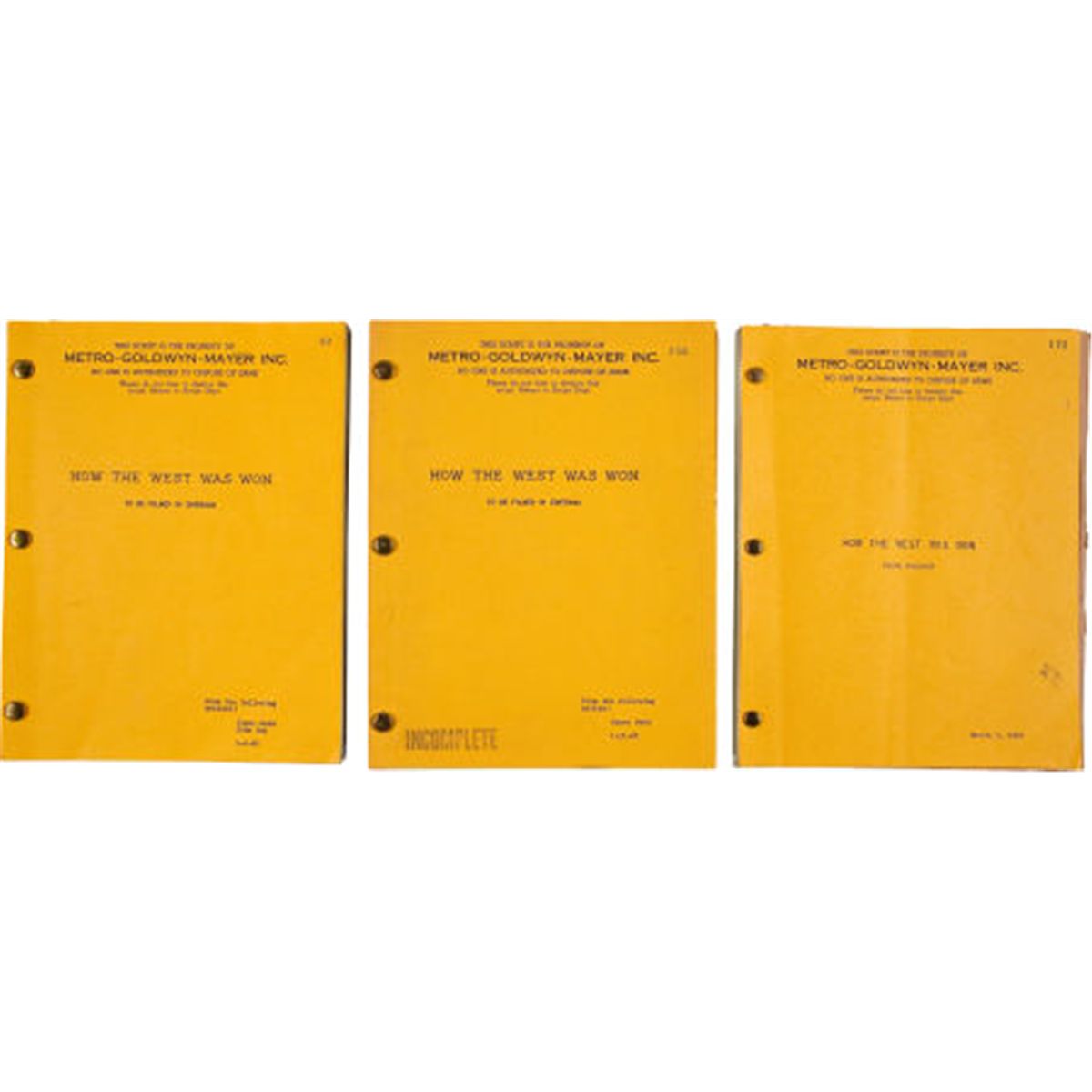 Three Scripts from "How the West Was Won." Metro-Goldwyn-Mayer, 1962. Goldenrod covers, screen play by James Webb and John Gay, each with a different date of "9-6-60," "1-31-61," or "March 7, 1962," one marked "Incomplete," 83 pages, 140 pages, and 166 pages, were Wayne's various file copies.11" x 9"