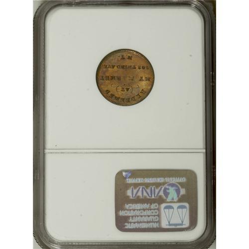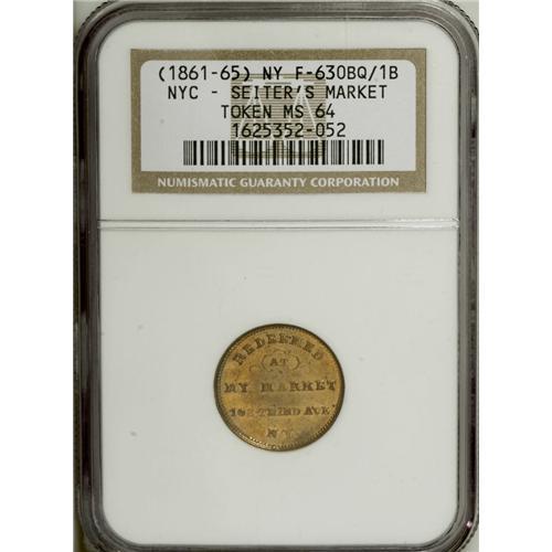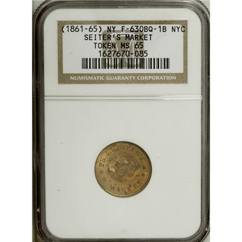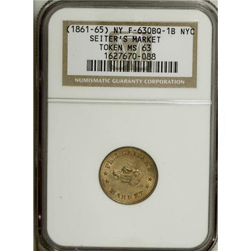 <B>Undated Seiter's Market, New York, NY, MS63 NGC,</B></I> Fuld-NY630BQ-1b, R.1, a small mark southeast of the boar; <B>Undated Seiter's Market, New York, NY, MS64 NGC,</B></I> Fuld-NY630BQ-1b, R.1, a lustrous apricot and lime near-Gem; and an <B>Undated Seiter's Market, New York, NY, MS65 NGC,</B></I> Fuld-NY630BQ-1b, R.1, shimmering gold and sea-green luster, minor obverse carbon. All three pieces show varying weakness of strike on the A in MARKET.<BR><BR><b>Shipping:</b> Coins & Currency (<a target="_blank" href="http://www.heritageauctions.com/common/shipping.php">view shipping information</a>)